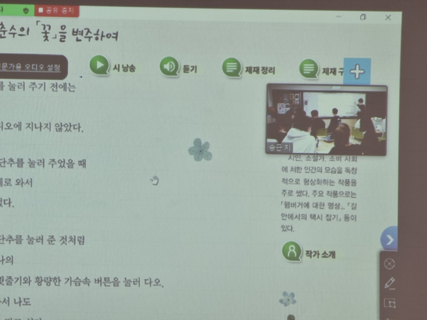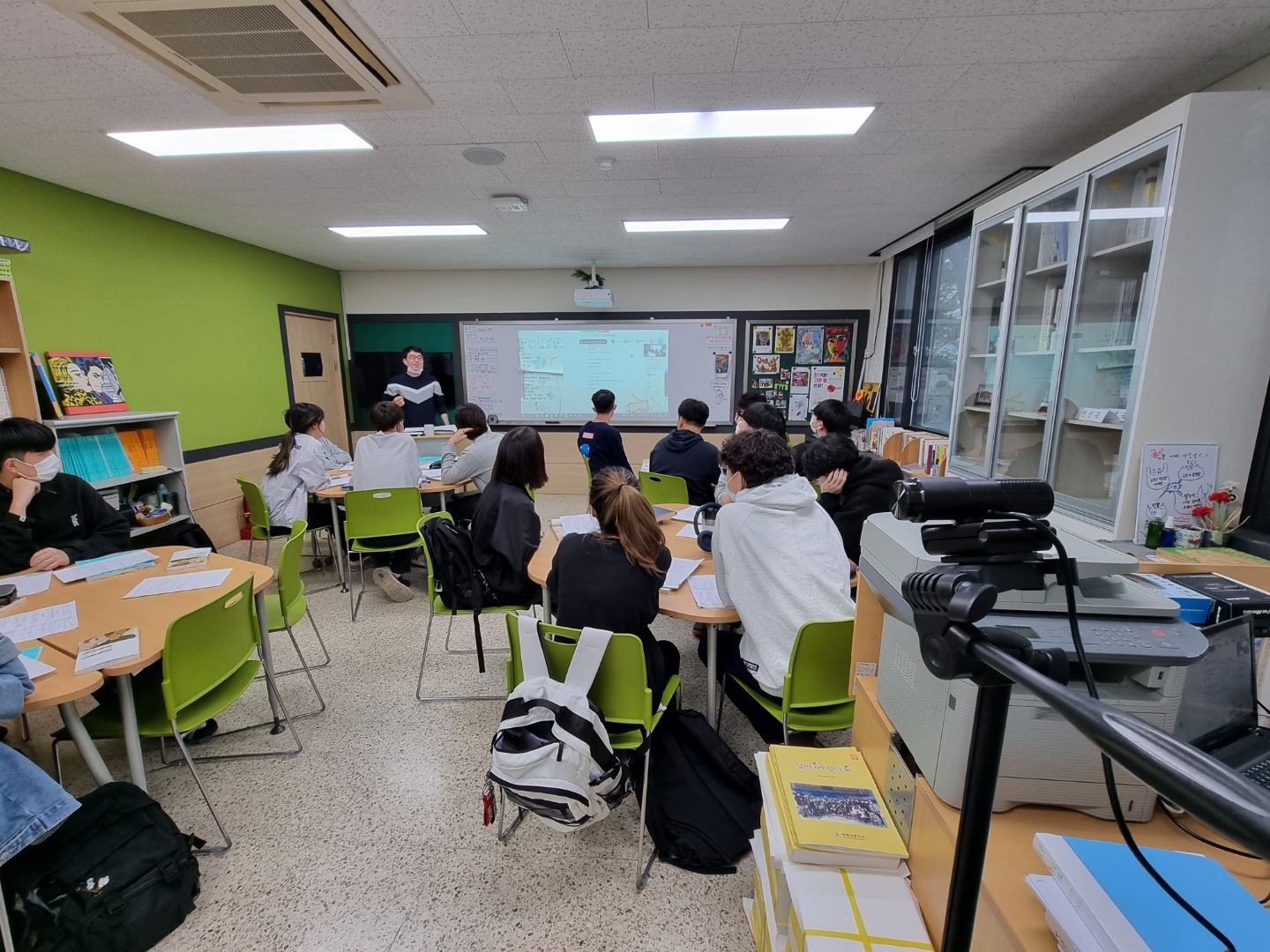 대면수업을 받는 학생들은 비대면 수업을 받는 학생들의 얼굴을 볼 수 있고, 비대면 수업을 받는 학생은 교실수업처럼 볼 수 있도록 하고 있습니다.
