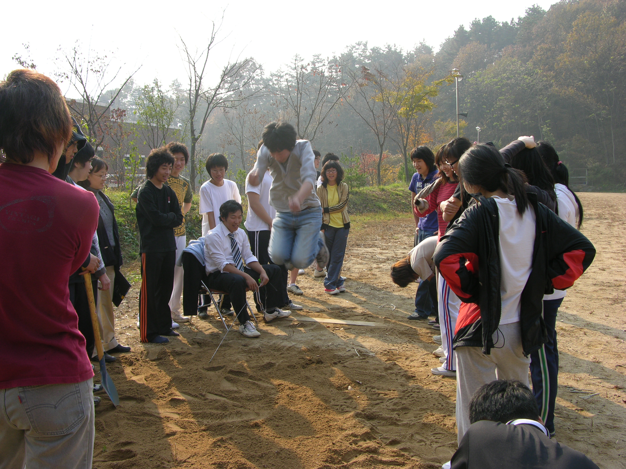 오늘 체력검사를 실시하였는데, 멀리뛰기하는 학생의 모습이보입니다.