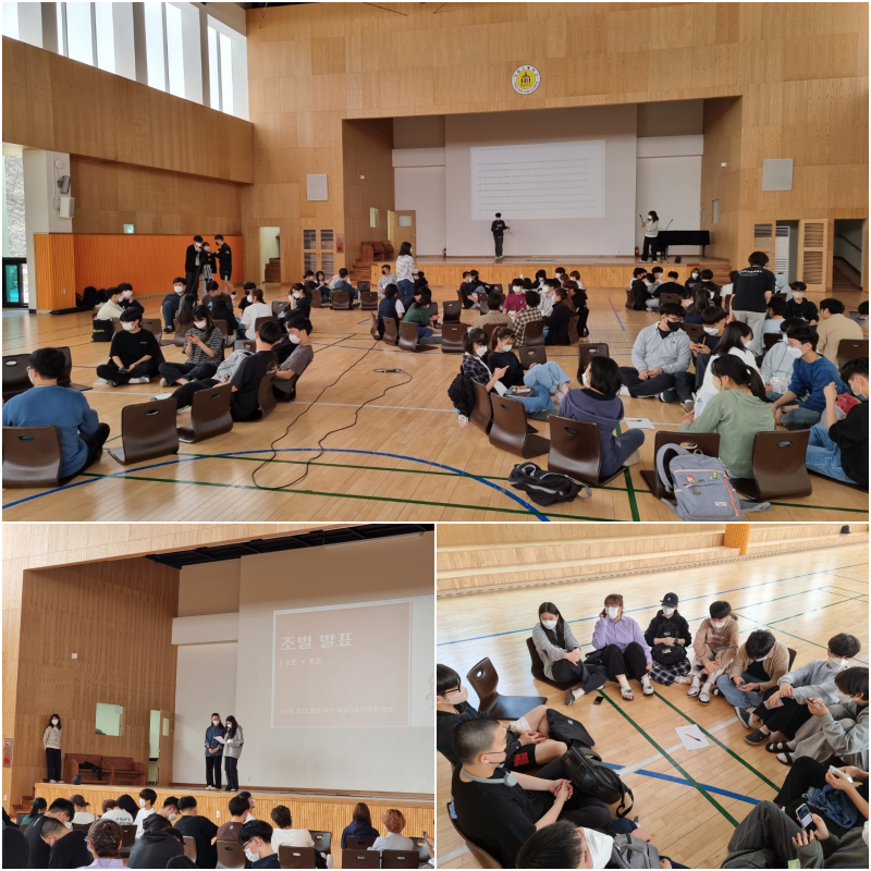 2022.04.11.(월) 5교시 양업 환희관에서 '양업의 문화'에 대하여 교직원 및 학생 전체가 모여 서로의 생각을 나누는 전체회의 시간을 가졌습니다.