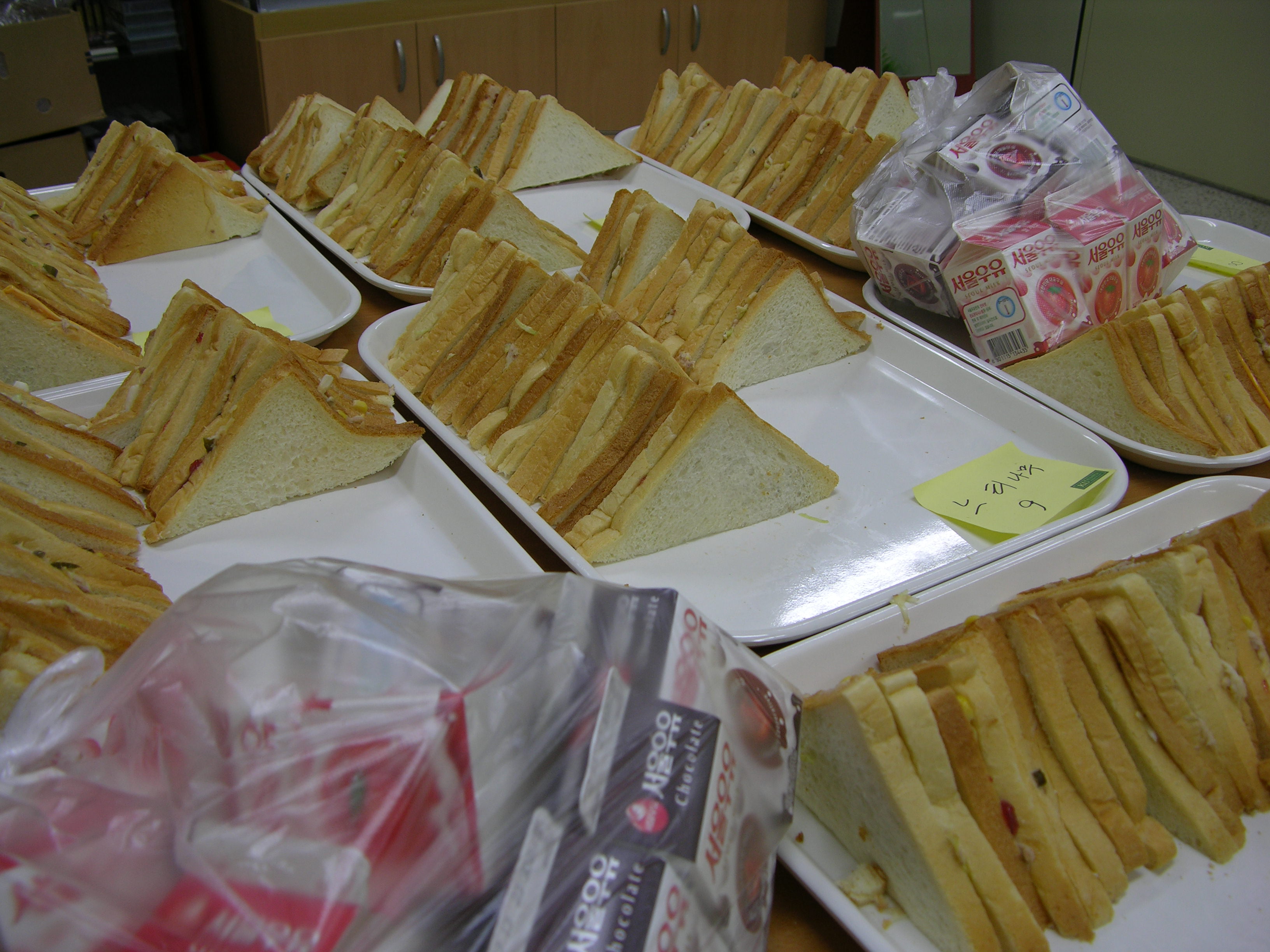 <P>지난 2주에 걸쳐서는 건강에 좋은 감자와 고구마를 한솥씩 쪄서 주었지만, 다양한 메뉴로 제공해 달라는 전체 조회시간의 건의 사항을 참고하여 어제는 샌드위치와 우유를 제공 하였답니다.</P>