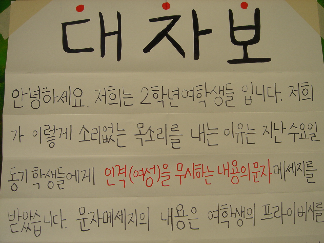 <P>그런 와중에 2학년 여학생들은 대자보를 식당 내려가는 길과 중앙홀(처음에는)에 떡하니 붙힌것이었다.</P>