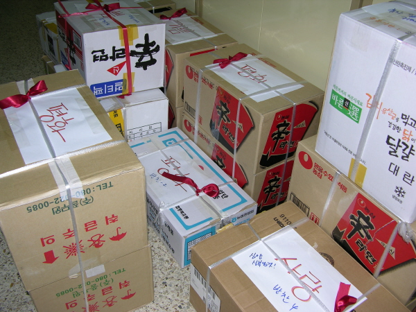 <P>박스안에는 신라면, 노랑뎅이, 김치, 젖갈, 멸치볶음, 오징어 맵게 볶음, 연근 우엉조림, 김, 고추장 등등으로...</P>