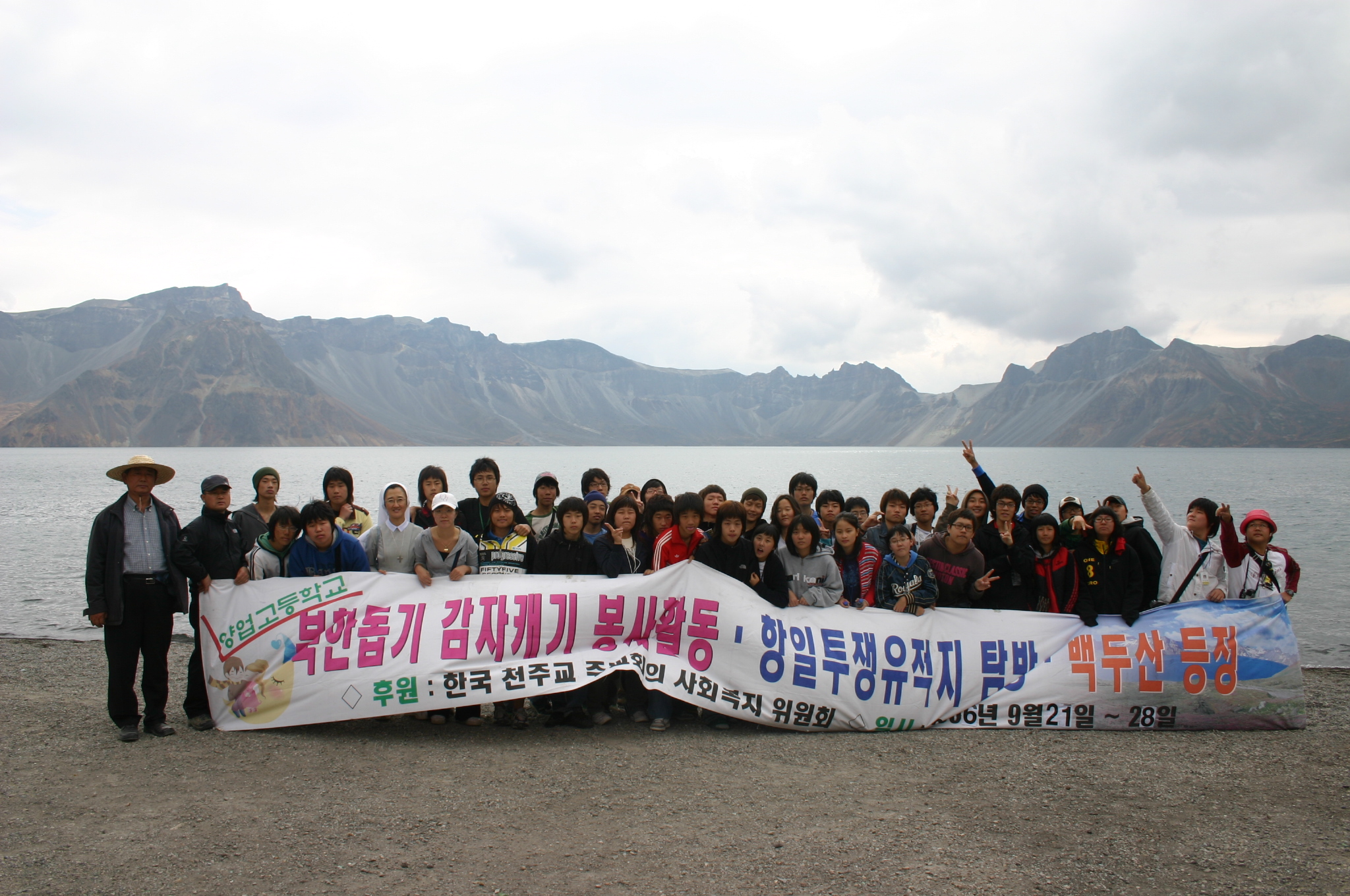 <P>학생들은 피곤함에도 불구하고 담날 새벽 3시 30분에 기상해서 백두산을 향해 떠났답니다. 연길에서 떠날때는 비가 내려서 이번 해에는 백두산 천지를 못보고 오는것이 아닌가 하고 우려 했지만, 3일간이나 감자 케기 봉사 활동을 한 우리 양업고 학생들을 특별히 이뻐하신 하느님께서는 맑은 날씨를 주셔서 아름다운 백두산 천지도 보고 사진도 많이 찍을수 있었지요. 백두산을 떠나자 마자 다시 비가 내리더니 천둥, 벼락이 내려쳤는데 바로 이것이 기적이 아닌가 하는 생각이 들었어요.</P>