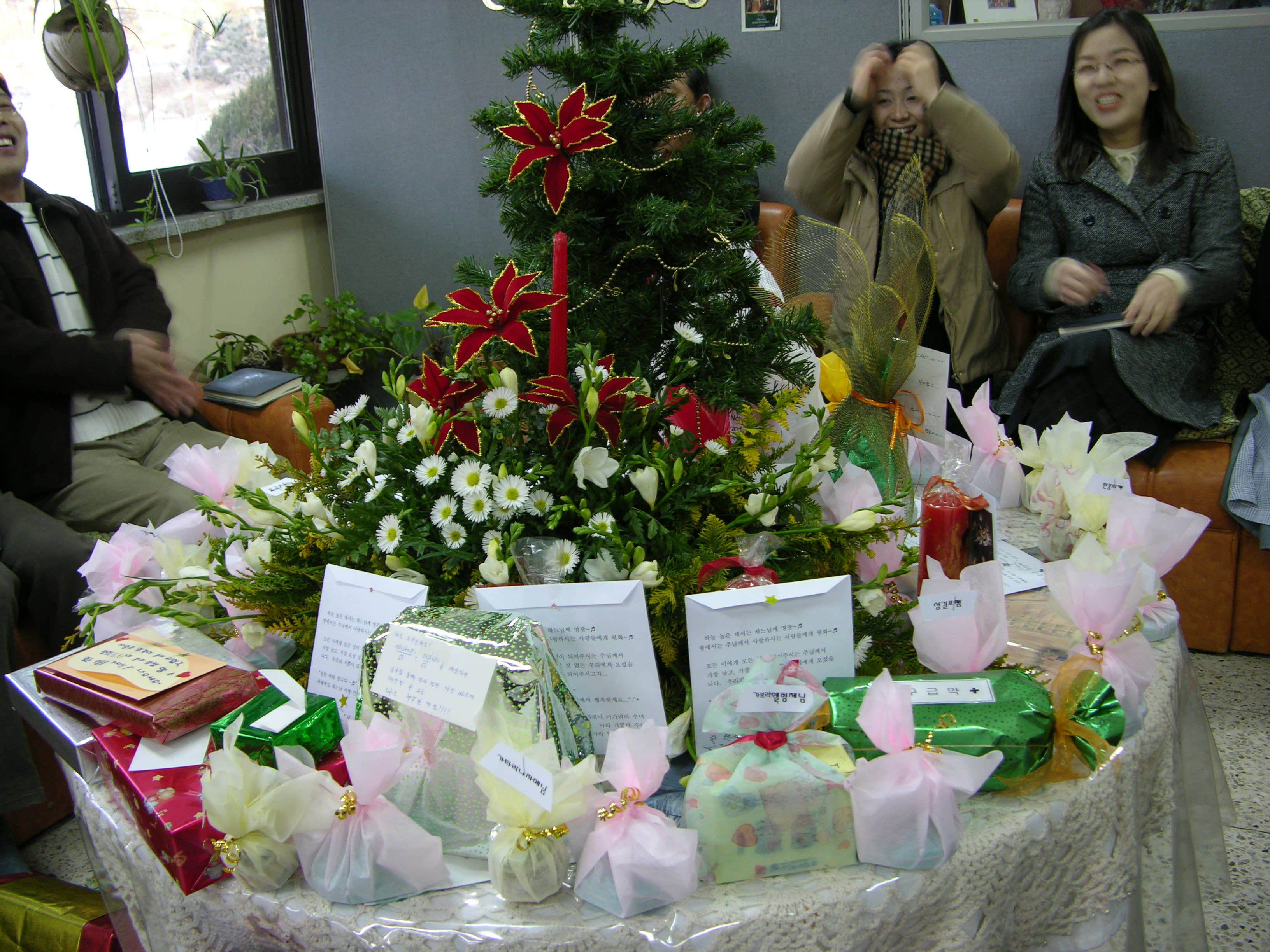 <P>교장 신부님은 70년대의 양은 노란 냄비와 신라면 5개, 맥주 6캔을 선물로 받았으셨고(1만원이 넘는 오류를 범함), 라쌤은 수납장을, 수나쌤은 보디로션과 클린져, 정은쌤은 방석,무릅담요,쵸콜렛, 바오로실장님은 눈에 굴러도 춥지 않는 털 잠바(이것도 1만원 초과상품), 저는 로션과 핸드크림을 받았지요.</P>