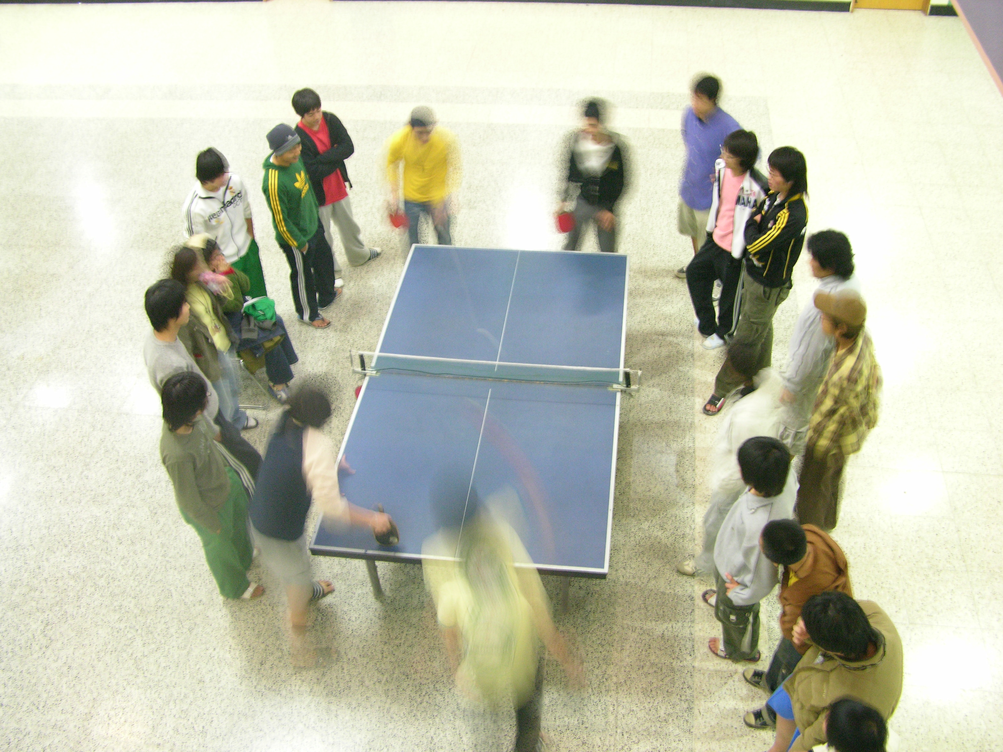 <P>지금은 1학년 소나무와 2학년 미루나무 학생들의 대접전이 펼쳐지고 있다. 웃찾사에서 본것 같은 어벙벙한 머리를 한 정연이와 둔한 몸으로 탁구공을 막아내는 몸짱 원용이의 강력한 스매싱은 상대방인 2학년들과 관전하고 있는 학생들의 탄성을 자아내고 있다. </P>