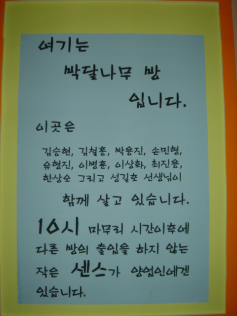환경심사시에 각 홈에서 평가를 하는 선생님들이 오셨을 때 보여준 이벤트가 특색이 있어 좋았다. 특히 1학년 여학생들은 공부하는 컨셉을 보여주다가 10시 마무리 시간이 되자 거실에 둘러 앉아 전체가 영어로 공동기도를 하는 모습은 평가하시는 선생님을 감동케 하였다고 하는데.......... 혹시 1등을 한 이유가 여기에.........? 그러나 누구나 보았을 때 1학년 하늘홈은 따뜻하고 창의적인 이벤트, 정갈한 분위기가 느껴졌었다...ㅎ