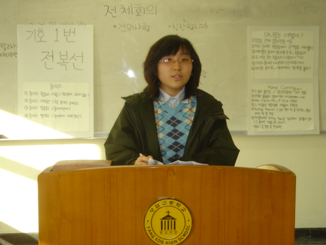그리고 여러분. 여러분은 양업고등학교가 어떤 학교라고 생각하십니까? 다른학교와 똑같습니까? 아닙니다. 우리학교는 대안학교입니다. 학생들의 특기와 적성을 살릴 수 있고,, 여러분스스로 주체가 되는 그런 대안학교입니다. 그러기 위해서는 동아리 활성화가 우선적이어야 된다고 생각합니다. 그러나 우리학교의 현실은 어떻습니까. 특기와 취미, 적성을 살릴 수 있는 가장 기본이 되는 동아리 활동이 전반적으로 부진합니다. 학교 수업에서는 배울 수 없는 것을 배울 수 있는 곳이 바로 동아리인데 이 동아리 활동이 부진하다는 것은 그만큼 여러분의 능력을 발휘할수 있는 곳이 적어진다는 것입니다. 그래서 저는 이 동아리부터 활성화 할 수 있도록 적극적으로 학생회에서 도와줄 수 있도록 하겠습니다.