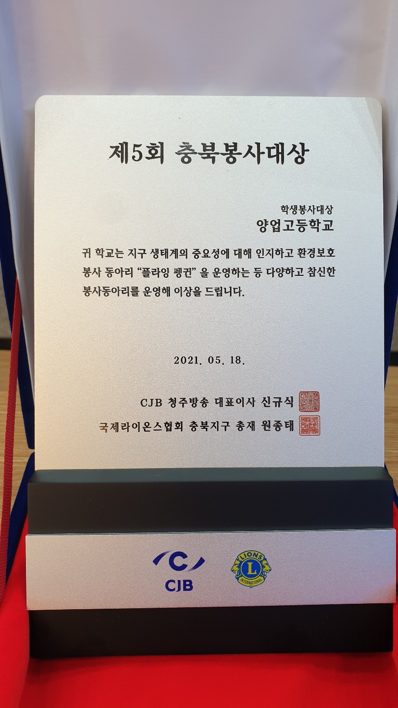 2021.05.18.(화) CJB 청주방송, 국제라이온스협회 충북지구 주관 제5회 충북봉사대상 학생봉사부문 대상을 양업고등학교가 수상하였습니다.