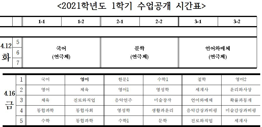 <공개수업 시간표>를 참고하셔서 각 학년 반에 참석하시면 되겠습니다.