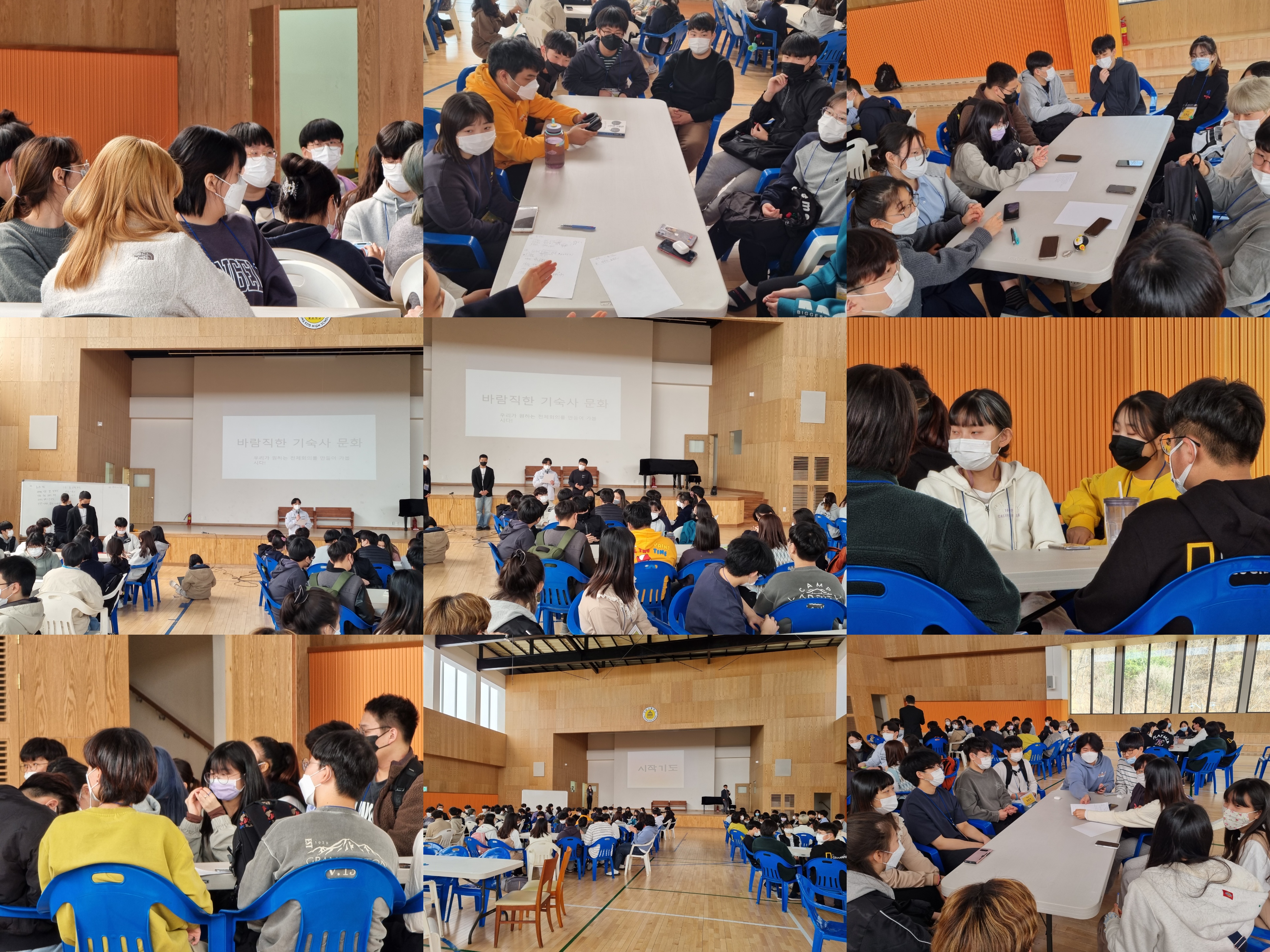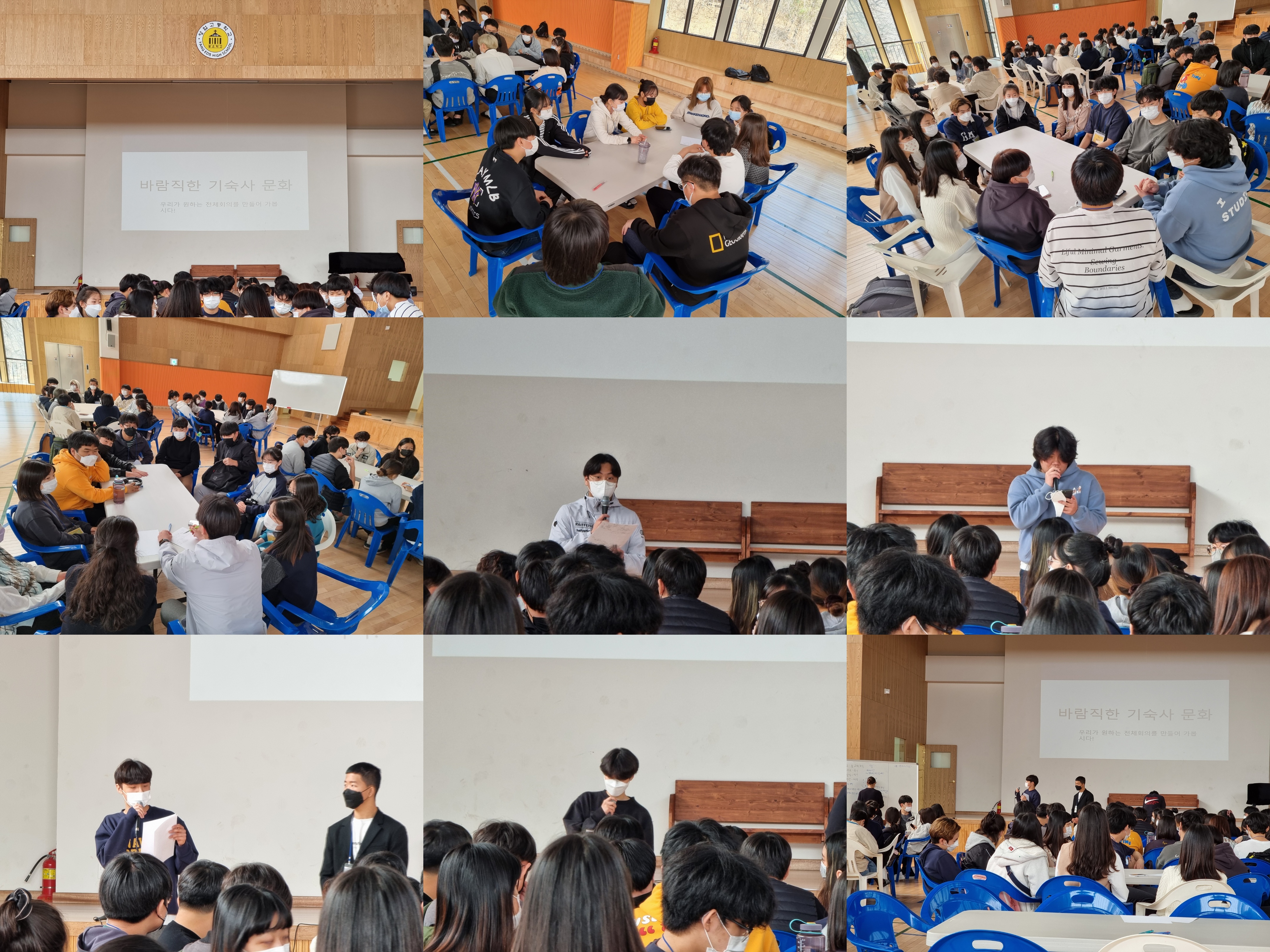 전체회의 주제는 '바람직한 기숙사 문화'라는 주제로 함께 생각하는 시간을 갖고 그룹별 토의를 통해 주제에 맞는 각자의 의견을 제시하였습니다.