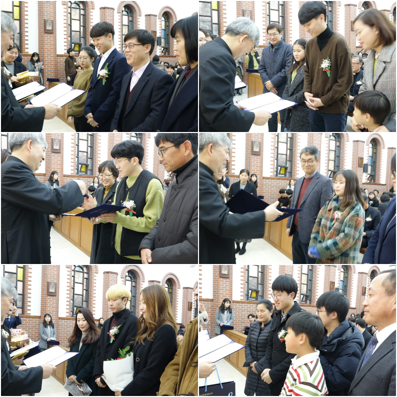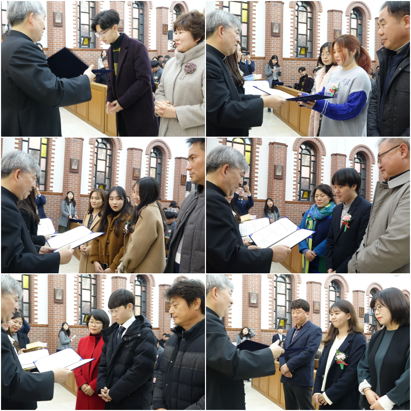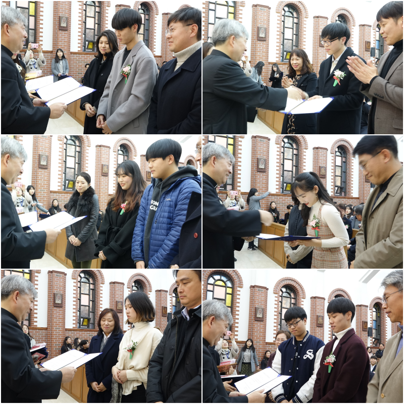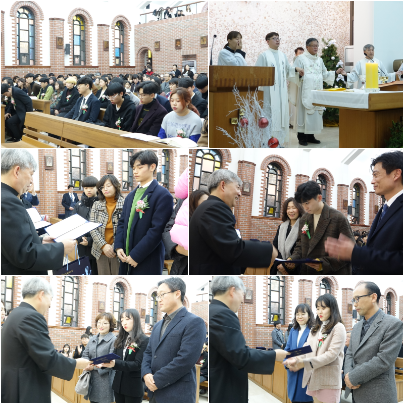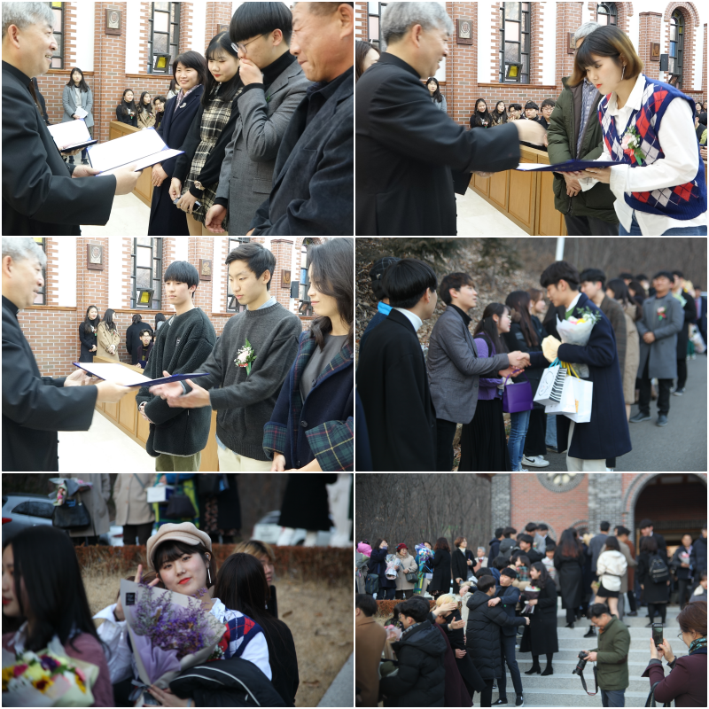 2019년 12월 28일 토요일, 사회로 발걸음 내딛기 위해 20기가 재학생들과 가족들에게 큰 박수를 받는 날인 졸업식입니다. 졸업생이 된 20기는 1시까지 경당에 모여서 연습을 하고 21기와 22기는 1시 30분에 모여서 준비한 것들을 연습했습니다. 미사를 통해 교장 신부님께서는 20기 모두에게 할 이야기들을 전했습니다. 2-3시, 약 1시간의 미사를 끝내고 바로 본격적인 졸업식을 시작해 20기의 시원섭섭한 모습이 보였습니다. 그 후 졸업장과 상장 수여식을 가졌습니다. 축사와 답가 등의 순서를 진행한 후에 석별의 정을 나누었습니다. 20기 모두가 꽃길을 걷기를 바랍니다.