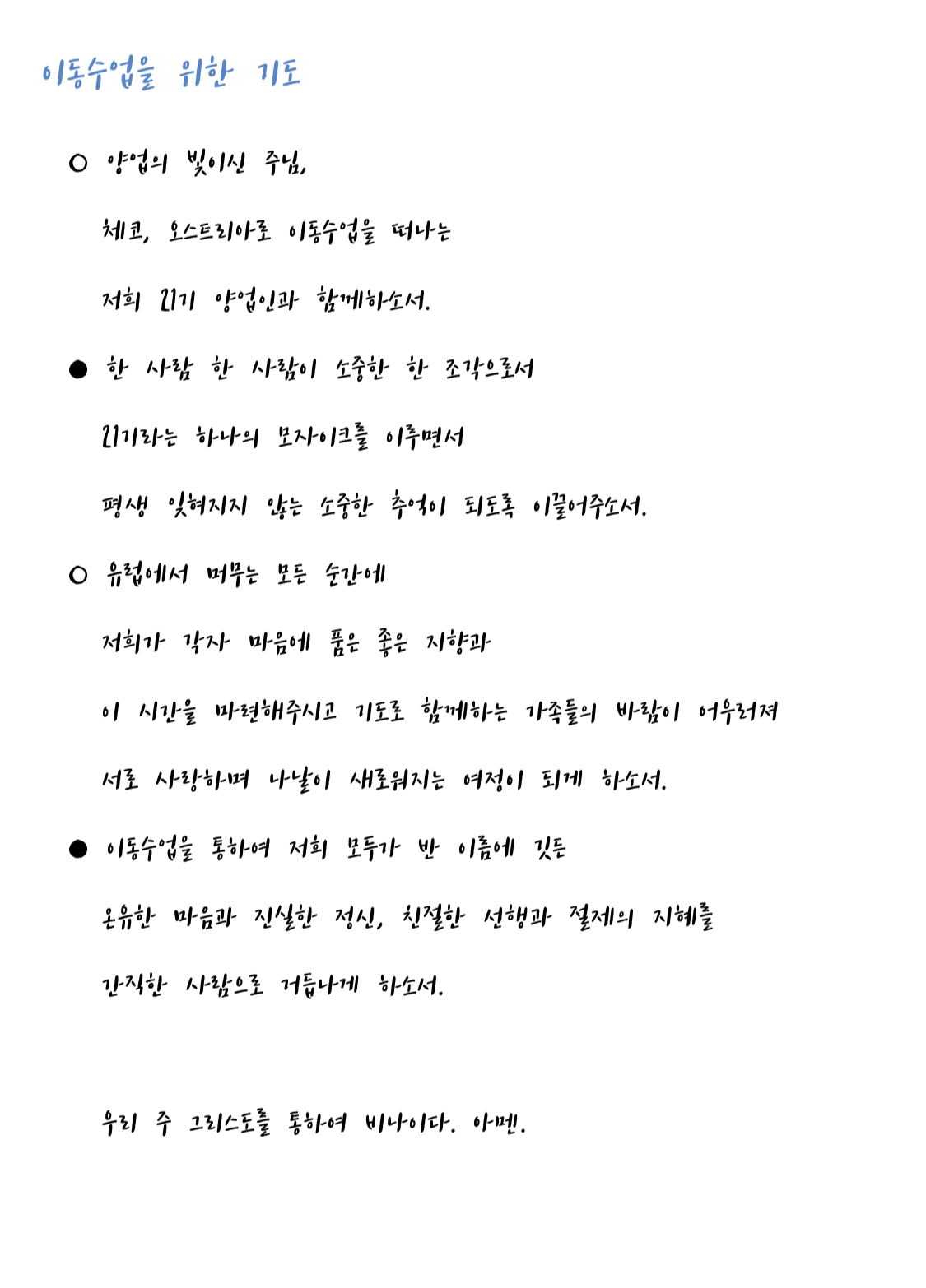 오늘부터 이동수업 준비를 위한 9일 기도를 실시합니다.