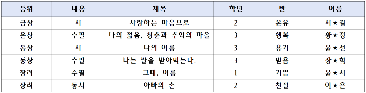 옥산소식 창간 10주년 기념 문예창작 작품공모전에 우리 양업 학생들이 우수한 성적으로 입상을 하였습니다.