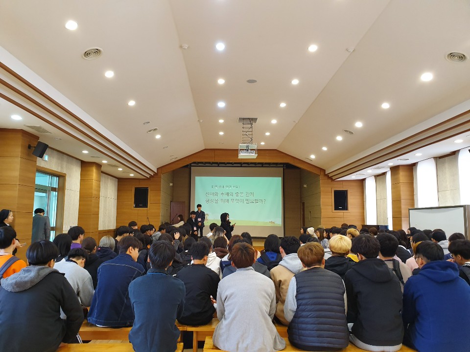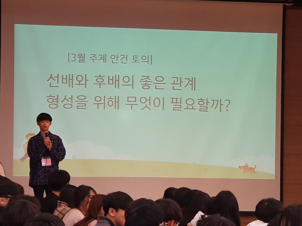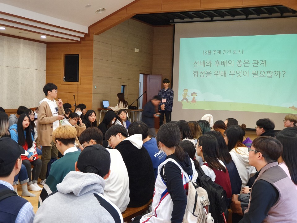 요번에 제안된 안건은 “선배와 후배의 좋은 관계 형성을 위해 무엇이 필요할까?”라는 주제로 전체 회의가 열렸습니다.