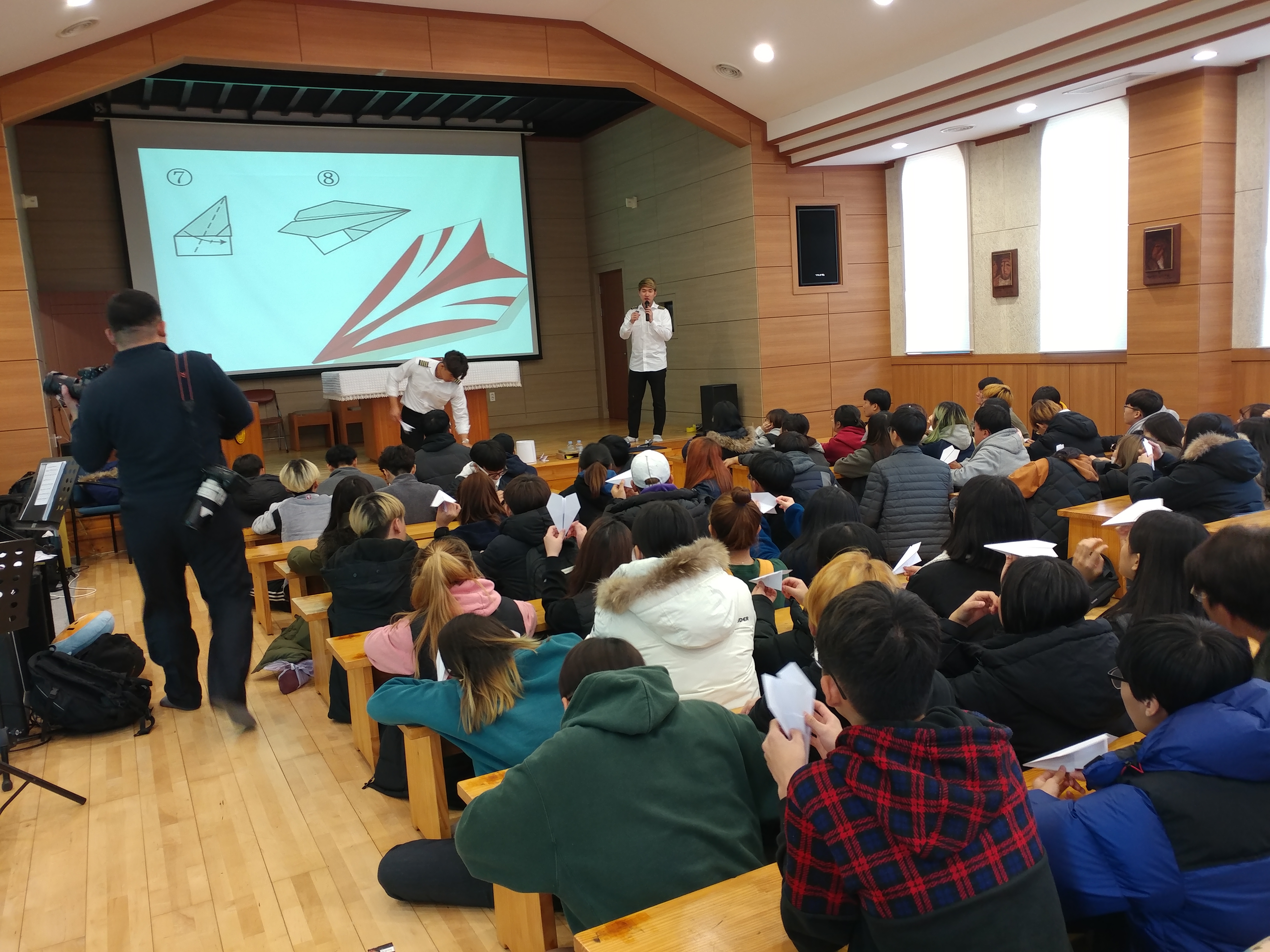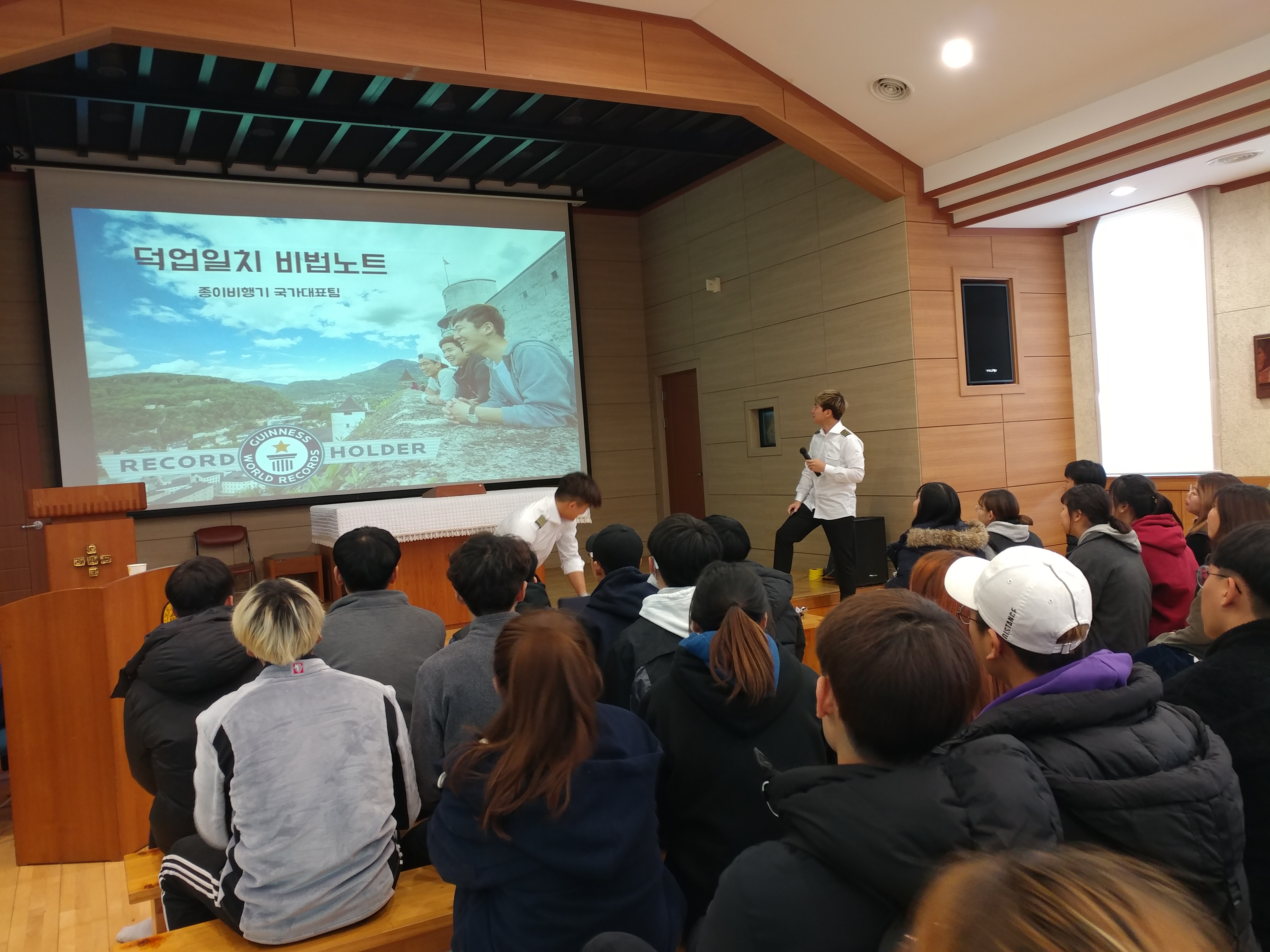 학교 내 대안교실 진로 특강과 관련하여 '종이 비행기'국가 대표 두 분을 초청하여 강연을 실시하였습니다. 하나의 취미나 특기를 살려 전문가가 되는 다양한 방법에 대해 활기찬 강연과 종이 비행기 시연과 만들기, 날리기를 통해 다양한 진로를 탐색하는 계기가 되었습니다.