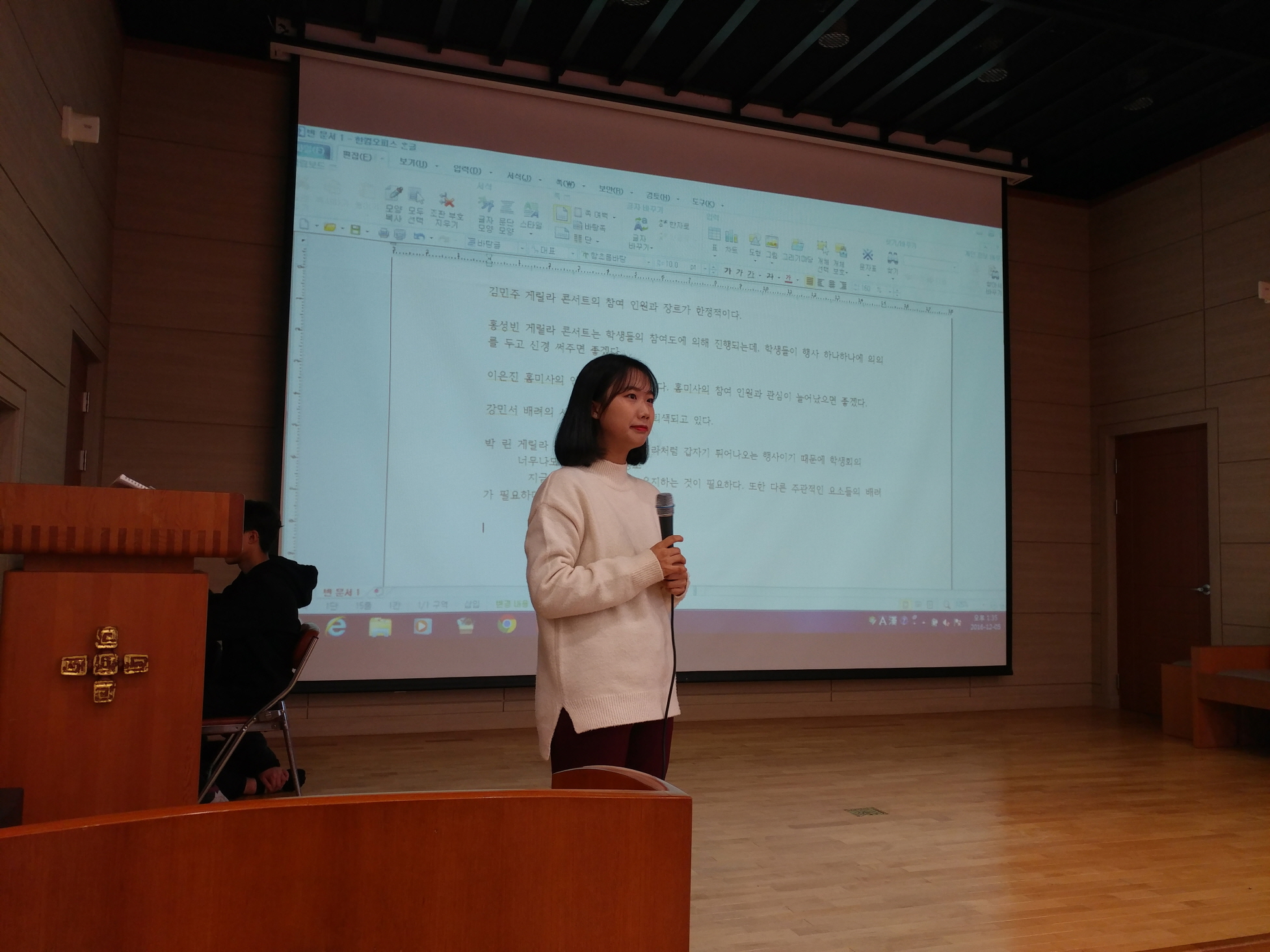 2016학년도 마지막 전체회의가 있었습니다. 오늘 회의에서는 '사라져 가는 양업 문화'라는 주제로 진행되었고 많은 학생들이 양업의 좋은 문화를 계승 발전시키기 위해 의견을 발표했습니다. 학교장 신부님께서는 훈화로 좋은 학교 양업의 학생자치회 활동이 활성화 되기 위해 지지와 격려, 박수를 보내 줄 것을 당부하였습니다.