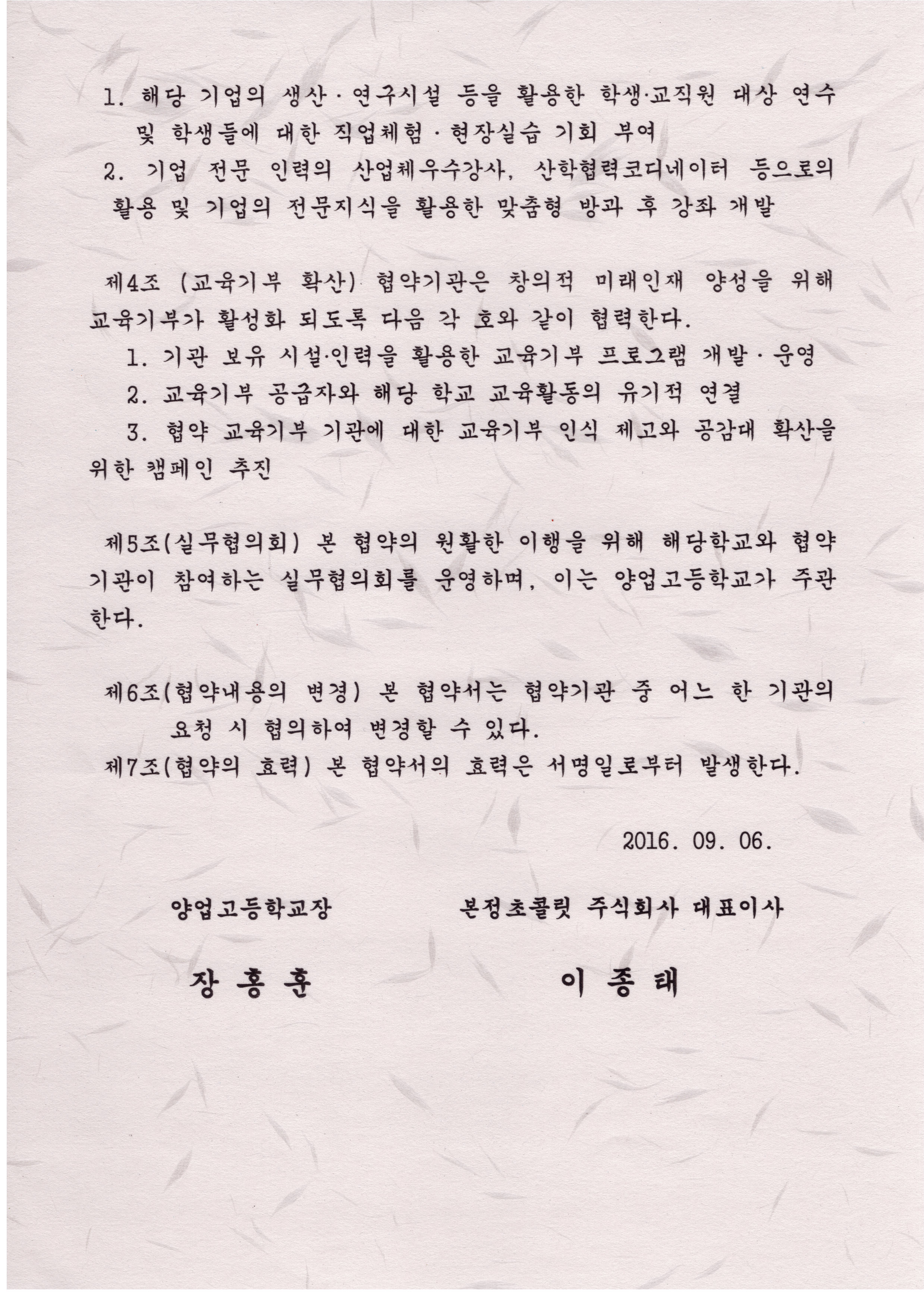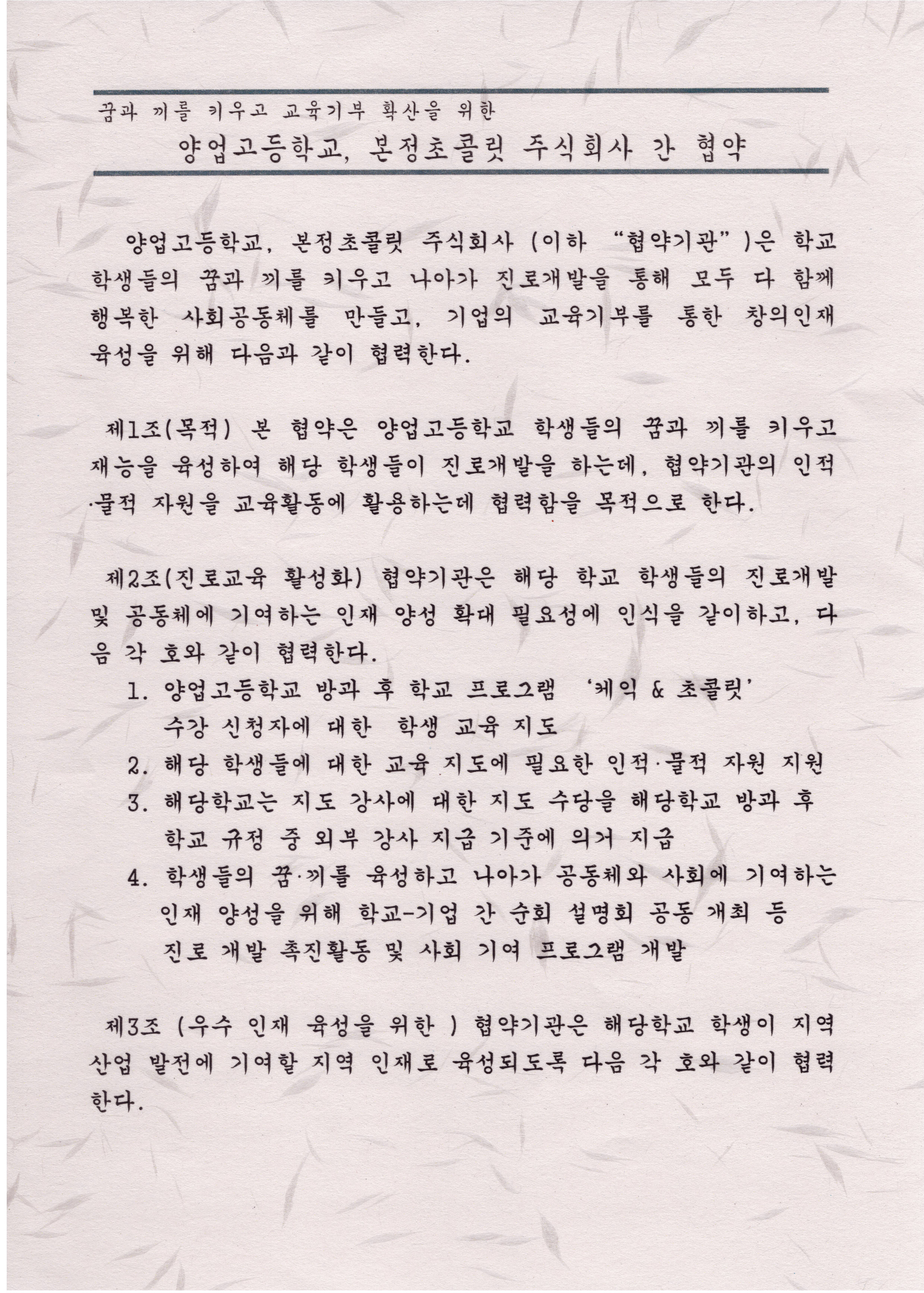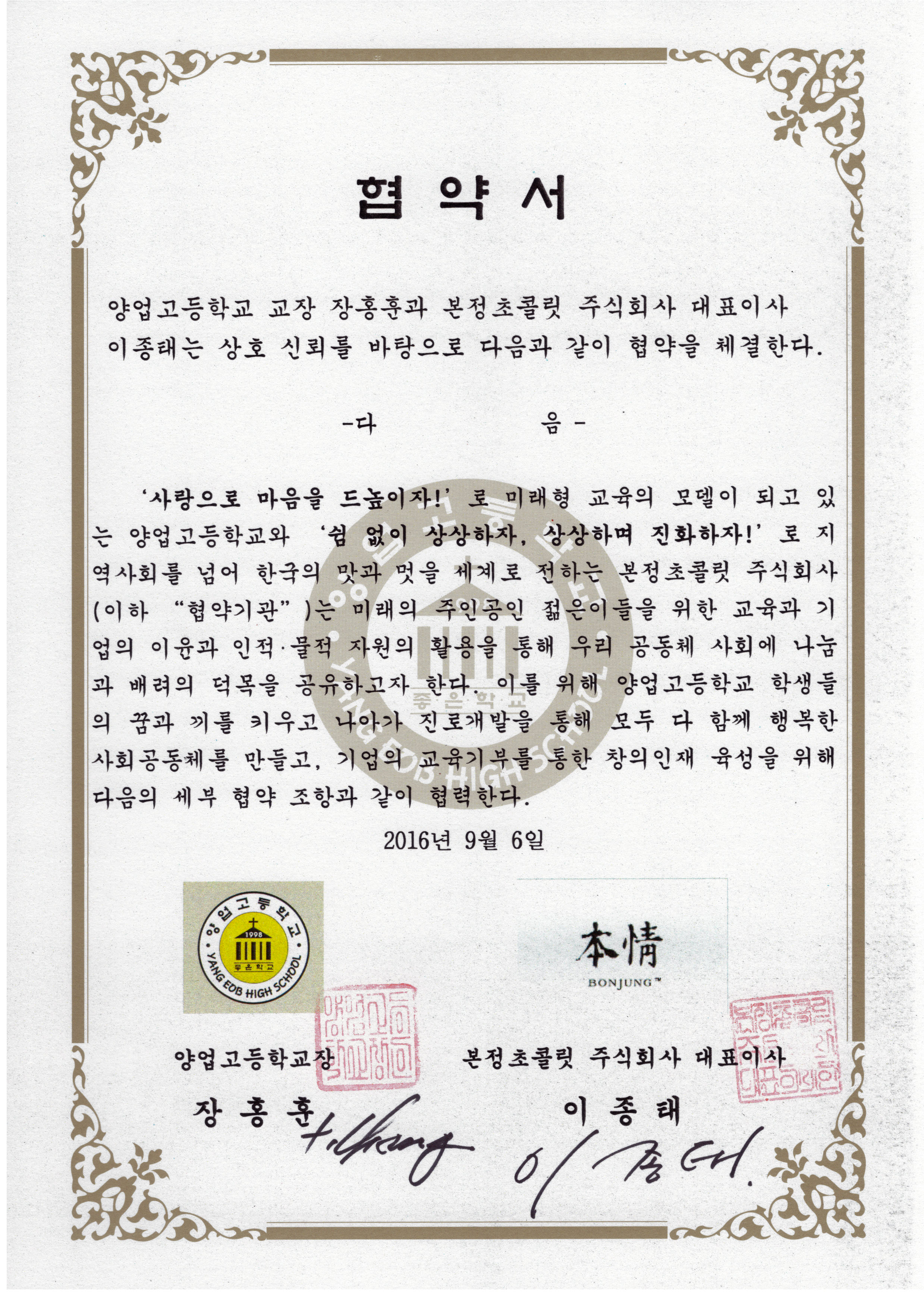 지난 9월 6일에는 우리학교에서 초콜릿과 케익으로 유명한 우리 고장의 명문 기업 본정초콜릿과 산학협력을 통한 교육기부를 위한 MOU체결이 있었습니다.