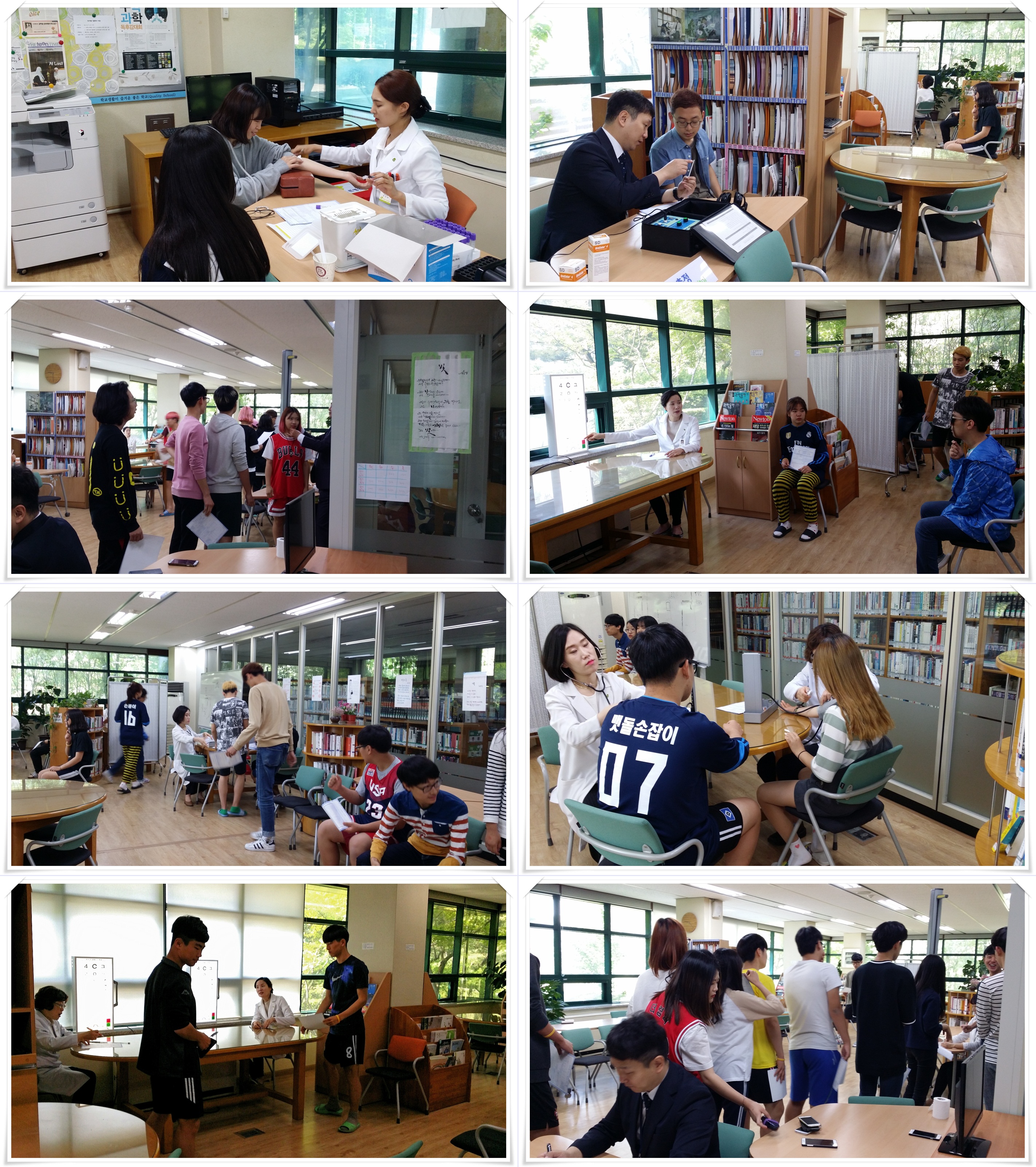 1학년 학생들은 신체계측부터 청력검사, 시력검사, 구강검사, 소변검사, 혈액검사(여자), 결핵검사 등 일반검진을... 2·3학년은 소변검사, 시력검사, 신체계측 항목의 3가지 별도검사를 반별로 순차적으로 진행하였습니다. 순서를 기다리며 서로의 건강검사 결과가 어떻게 나올지 긴장하는 모습도 보였는데요.. 특히 키와 몸무게를 잴 때는 3월 입학할 때보다 친구들의 키가 몇 센치나 자랐는지 몸무게가 얼마나 늘었는지에 대해서 서로 이야기하는 모습들이 재미있었습니다. 남학생들은 조금이라도 큰키를 자랑하고 싶었는지 검사 전 팔굽혀펴기를 하거나 높이뛰기를 하는 재미있는 모습도 보여주었습니다.