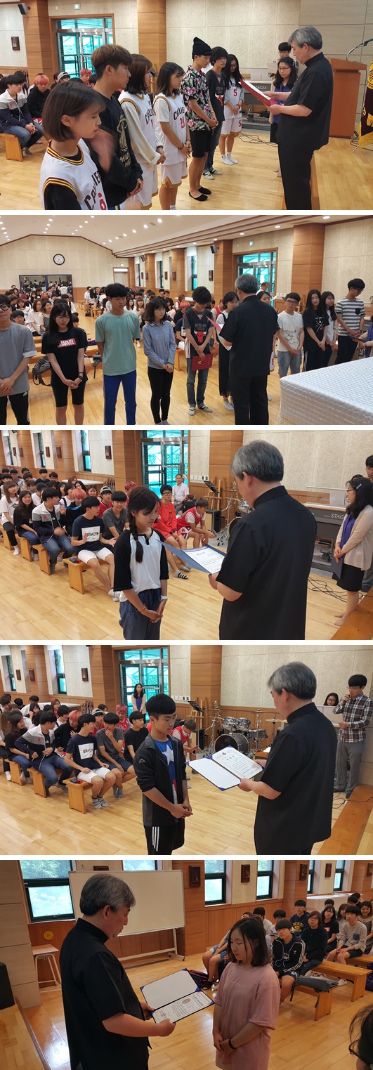 오늘 전체조회에서는 2016 대한민국 국제요리(제과)경연대회 라이브부문, 제17회 청주 청소년 효한마음 축제 연예2 부문 동상, 연극부문 장려상, 충청북도 삼락회장상, 사단법인 대한사립중고등학교장회 봉사상에 대한 상장 및 표창장 수여가 있었습니다.