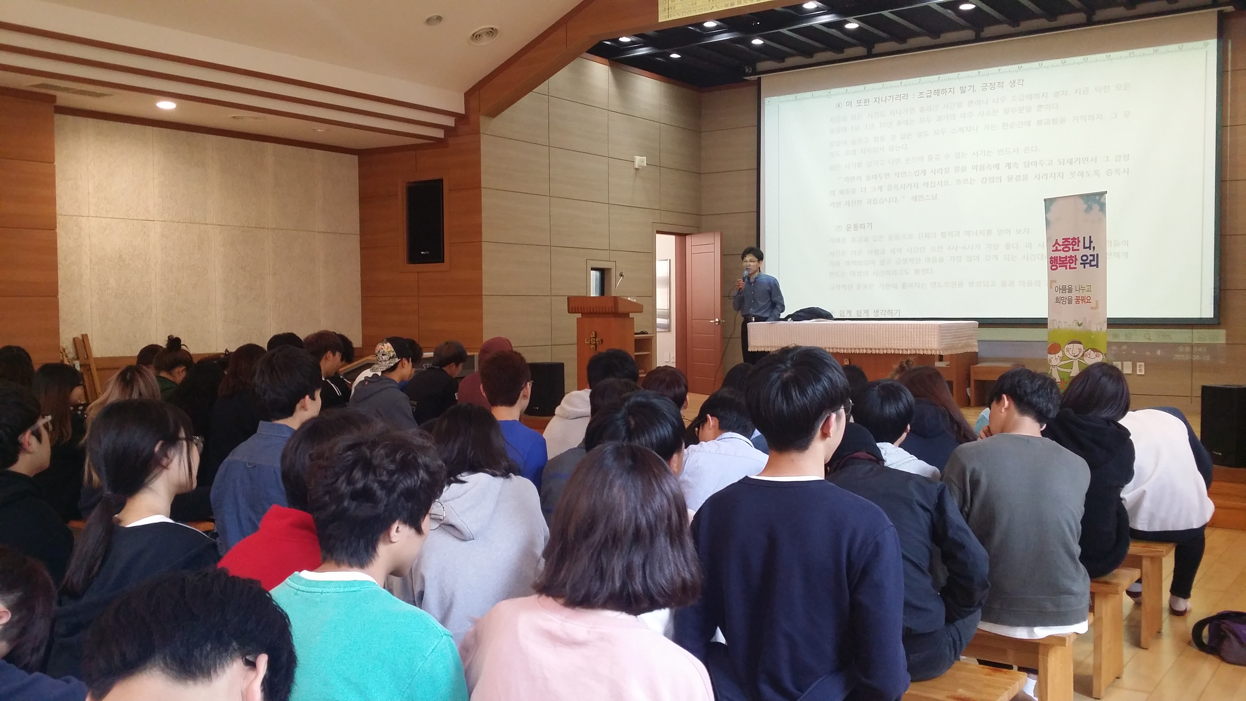 2016년 4월 18일 15시 20분부터 1시간동안 청주시 서원·흥덕 정신건강증진센터 유응모 선생님과 자기 자신을 소중하게 생각하고 주변사람들과 좋은 관계를 형성하는 방법에 대해서 이야기를 나누어 보았습니다. 손 꼭 잡아주기, 등 토닥토닥해주기, 어깨 주물러주기, 머리 쓰다듬기, 꽃이나 초콜릿 같은 작은 깜짝 선물주기, 미소짓기, 인사하기 등...서로에게 긍정적인 에너지와 즐거움을 줄 수 있는 다양한 방법들을 이야기하였는데요...
