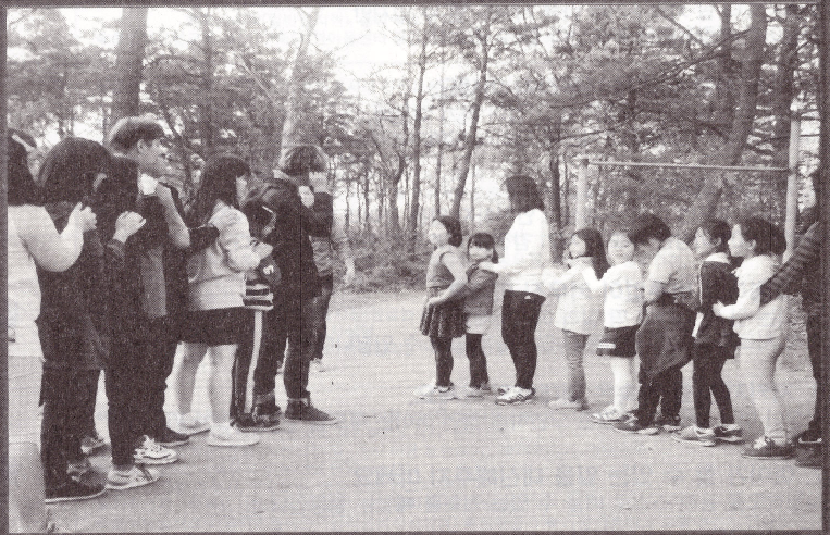 사진에서는 꼬리 잡기를 하기 전 가위 바위 보를 하는 장면입니다.