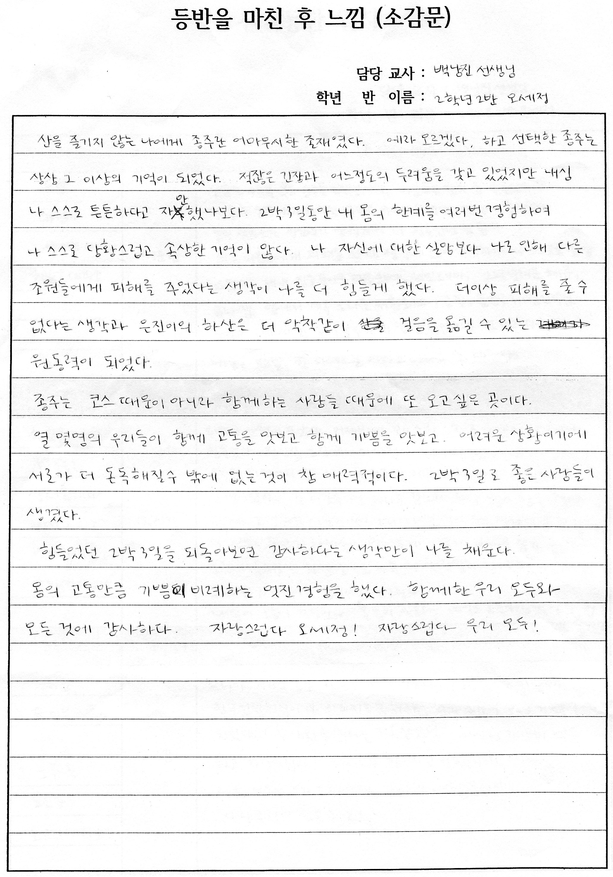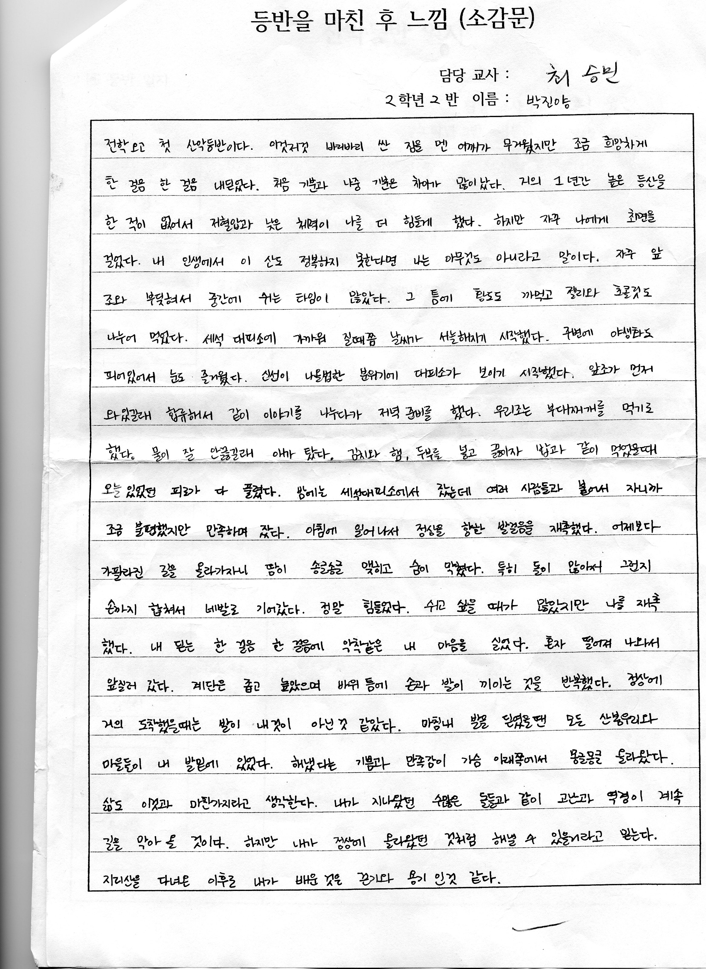 혹시 이곳에 글이 오른것에 대해 개인적으로 불편한 사람은 산악등반 담당교사에게 연락바랍니다.