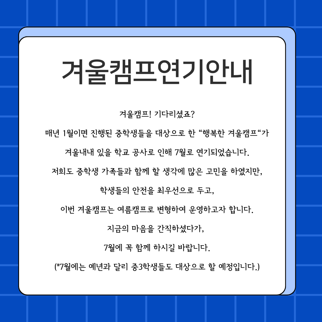 "2025.행복한 겨울캠프"가 2026년 1월에 진행될 예정이었으나, 7월로 변경하여 운영할 예정입니다.