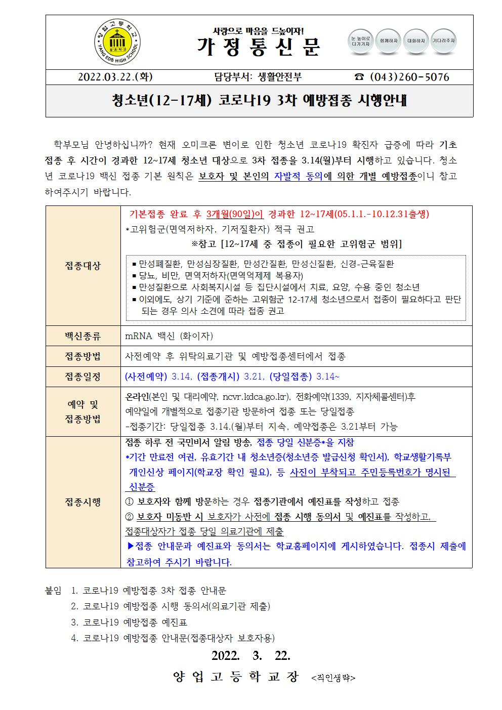현재 오미크론 변이로 인한 청소년 코로나19 확진자 급증에 따라 기초 접종 후 시간이 경과한 12~17세 청소년 대상으로 3차 접종을 3.14(월)부터 시행하고 있습니다. 청소년 코로나19 백신 접종 기본 원칙은 보호자 및 본인의 자발적 동의에 의한 개별 예방접종이니 참고하여주시기 바랍니다.