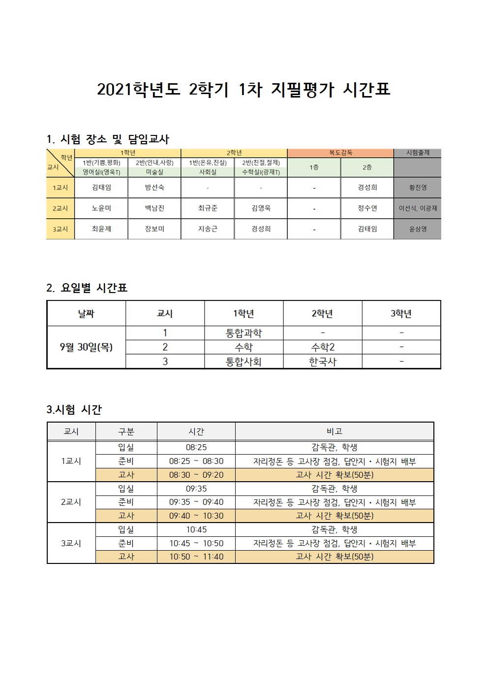 2021년 2학기 1차 지필평가 안내
