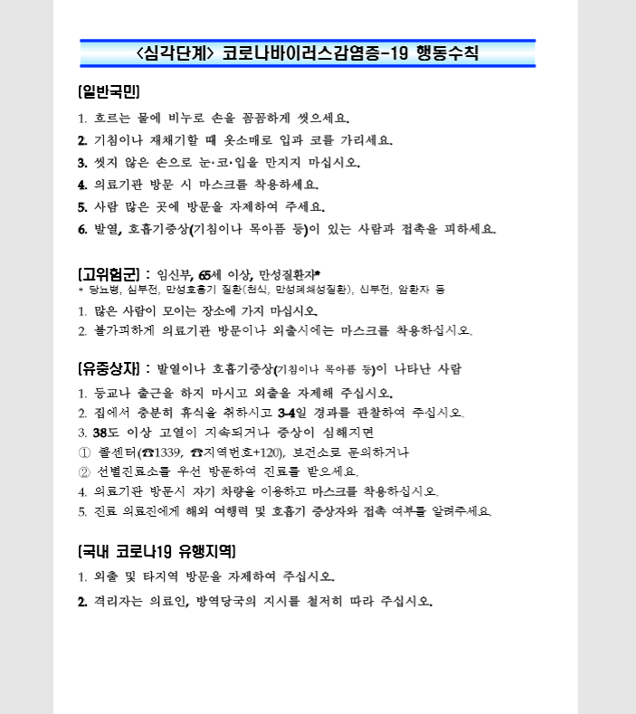 국가위기경보 수준 심각단계 격상에 따라 코로나 19예방을 위한 국민행동 메시지가 다음과 같이 변경되어 알려드리니 건강관리에 유의해 주시고 적극 협조해 주시기 바랍니다.