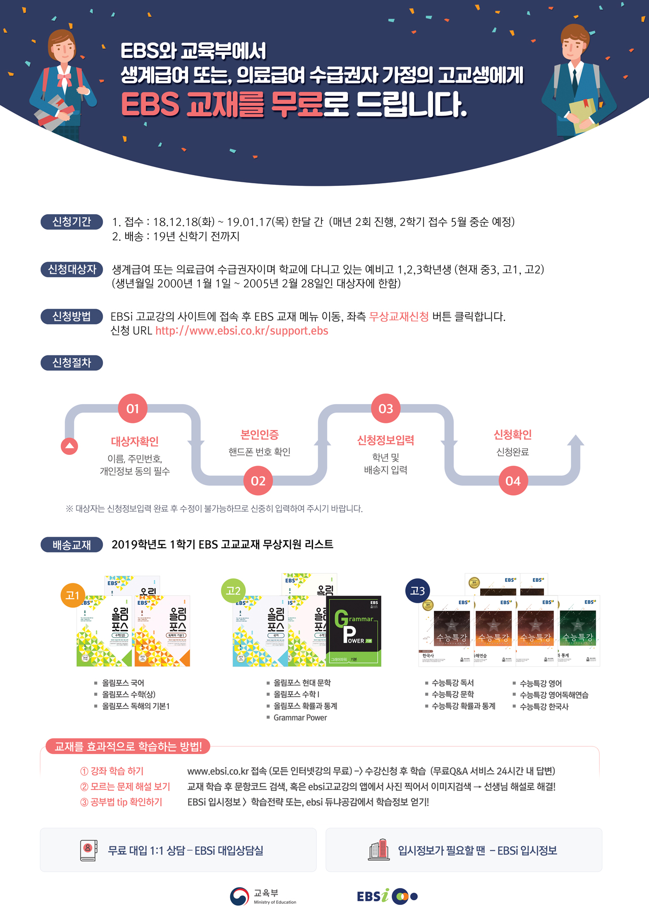 아울러 EBS교재 지원에 관한 사항도 안내해 드리오니 참고하여 주시기 바랍니다.(2019.03.13까지 연장신청가능)