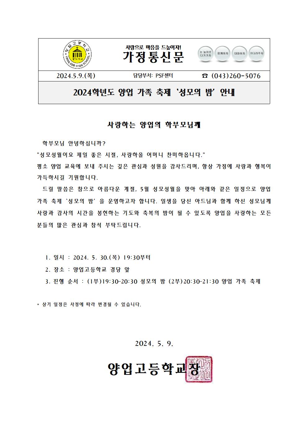 평소 양업 교육에 보내 주시는 깊은 관심과 성원을 감사드리며, 항상 가정에 사랑과 행복이 가득하시길 기원합니다.