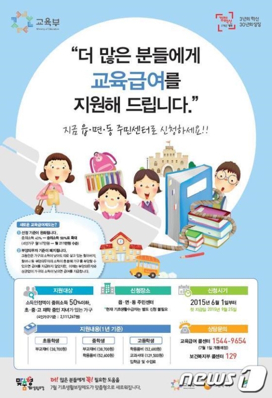 새로운 기초생활보장제도의 시행으로 더 많은 분들이 교육급여를 받을 수 있게 되었습니다.