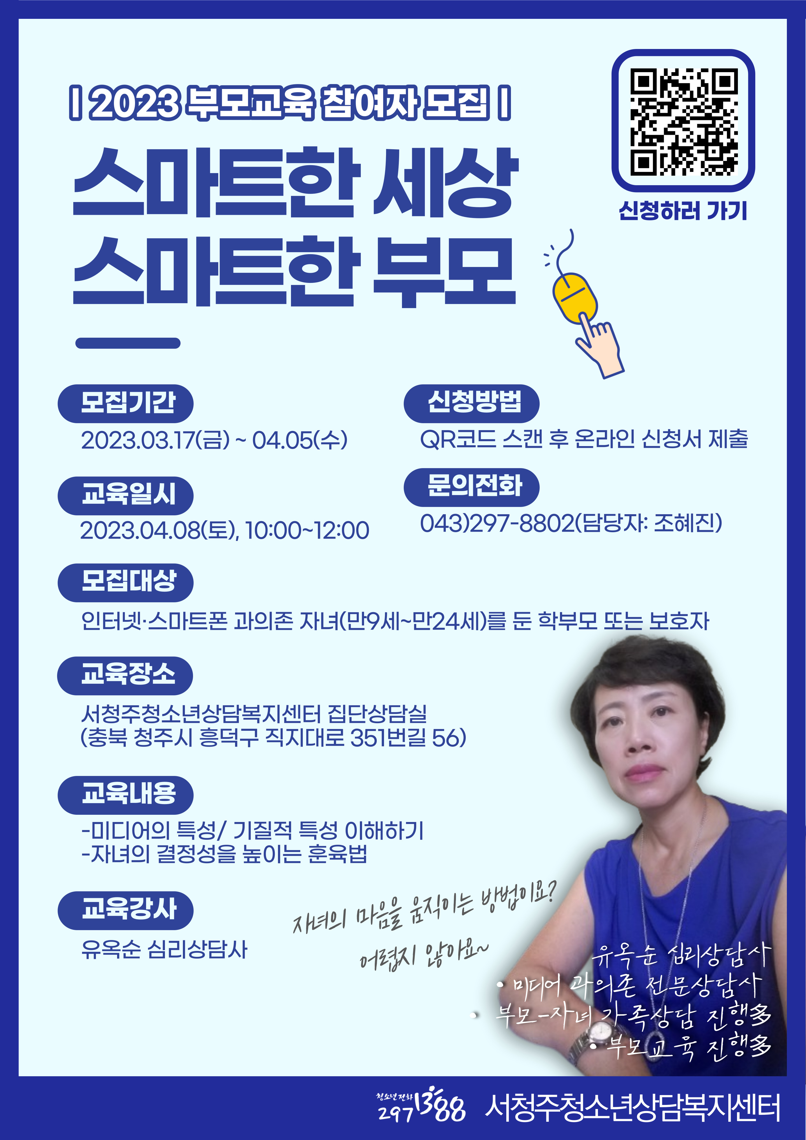 2023. 서청주청소년상담복지센터에서 '스마트한 세상, 스마트한 부모' 부모교육 프로그램을 운영합니다. 자세한 사항은 첨부된 파일 참고해주시기 바랍니다.