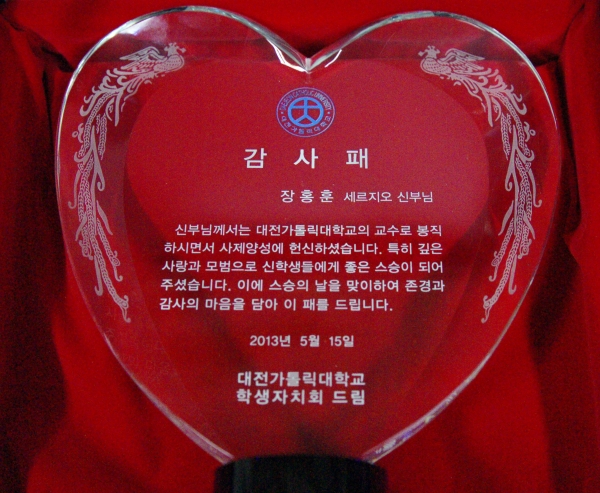 자유소재 대전 가톨릭대학교 학생 자치회 감사패