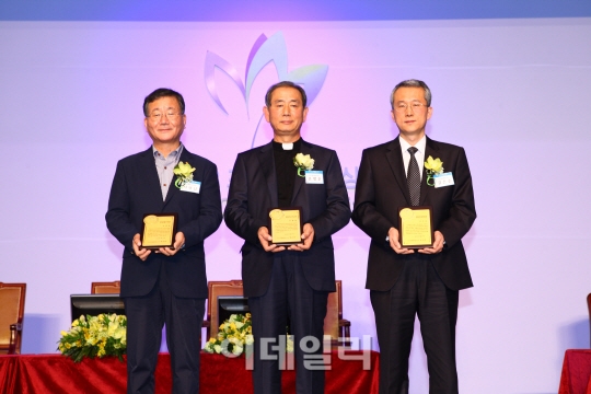 왼쪽부터 청암봉사상에 서영남 민들레국수집 대표, 청암교육상에 윤병훈 양업고등학교 초대교장, 청암과학상에 김은준 KAIST 교수. 포스코제공.