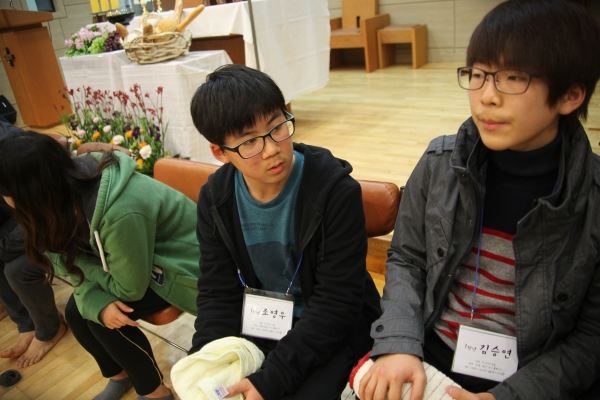 주의 만찬미사중에 거행하는 발씻김 예식을 하는중에 걱정스레이 바라보는 1학년 홈대표 영우, 승연 너무 귀엽네요