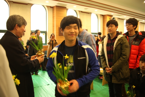신입생 입학 미사후에 교장 신부님께서 수선화를 선물로 나누어 주셨습니다.
