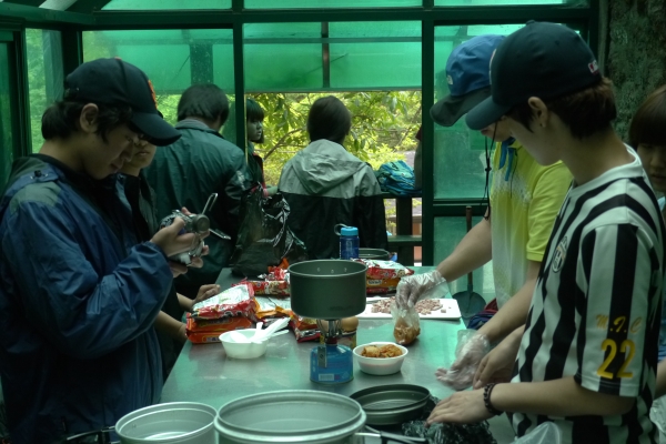 천왕봉을 지나 가파른 내리막길을 내려와서 로타리 대피소에서 점심을 먹는데