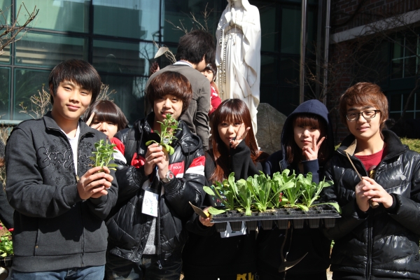 오늘 노작 시간에 2학년 학생들이 성모님 상 앞에 예쁜 꽃을 심었어요.
