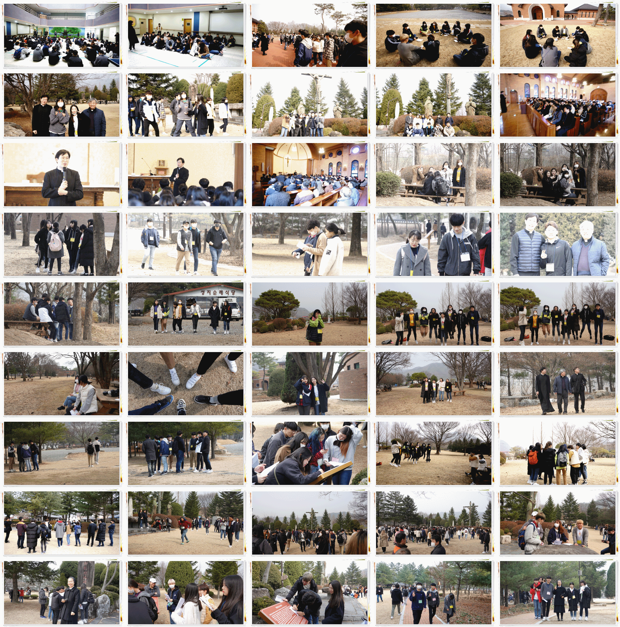 3월 5일, 작년과 달리 연풍 성지를 순례했습니다. 세 녀석과 함께 앉아 미사를 드리고 신부님의 좋은 말씀도 들었습니다. 그 후 식사와 세 녀석 미션, 단체 사진 촬영이 있었습니다. 학교에 돌아와서는 학생회와 동아리 소개 및 질의응답을 진행하였고 7시부터는 게릴라 콘서트를 진행해서 모두가 즐길 수 있는 자리를 마련했습니다.