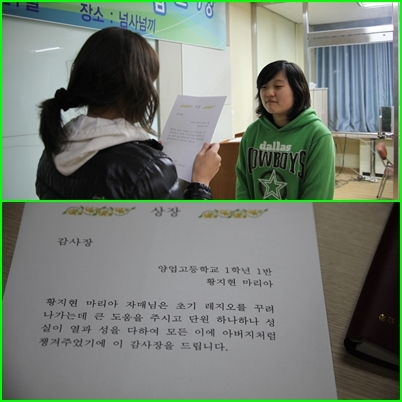 뚜비 장군 황지현 학생이 레지오의 서기로서 그동안의 노고를 치하하는 상을 받음.