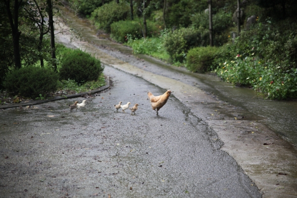 어미닭을 앞장 세워서 병아리 5마리가 죽지 않고 줄서서 모이를 먹으러 나타났어요~