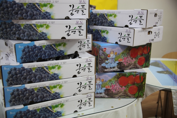가인수녀님이 농수산물 센터에 가서 싱싱한 포도와 천도 복숭아를 구매해서 돌아왔어요. 매주 목요일에도 .. 신경을 쓸 예정입니다.감자, 옥수수, 고구매등등으로..ㅎㅎ