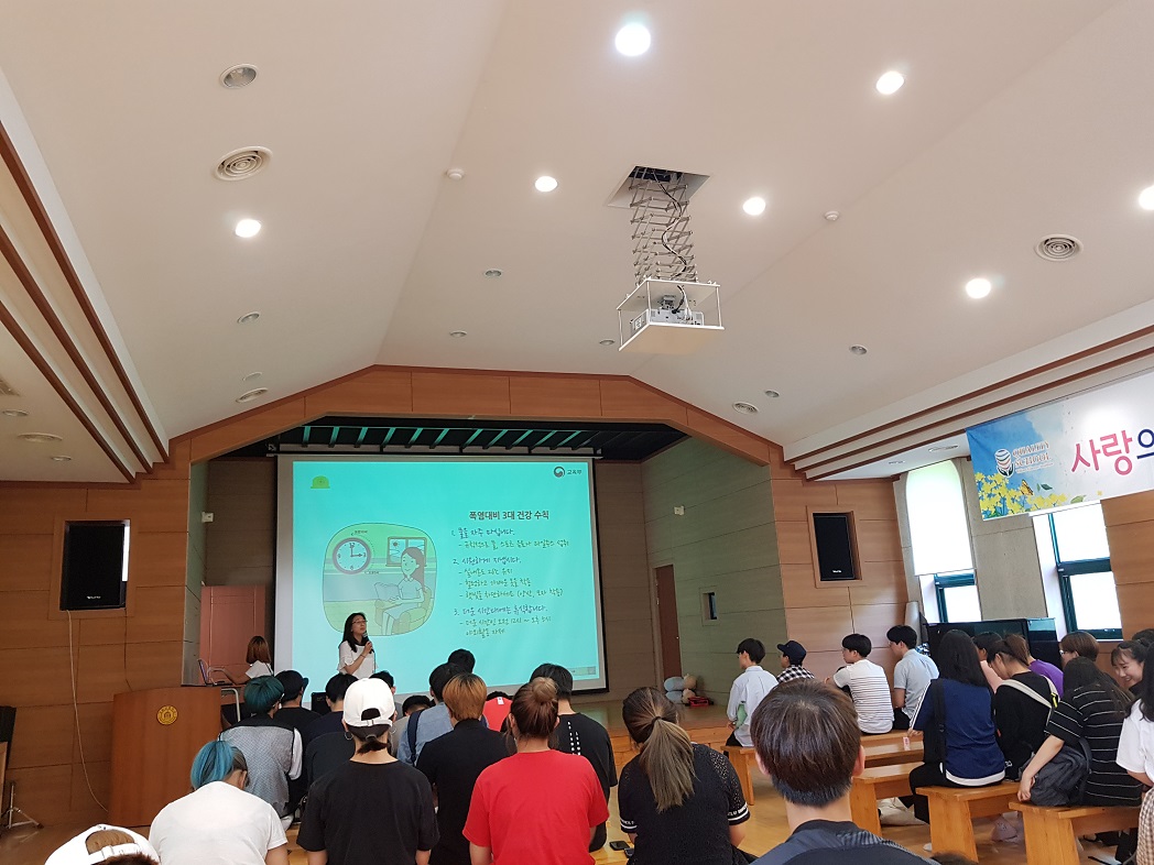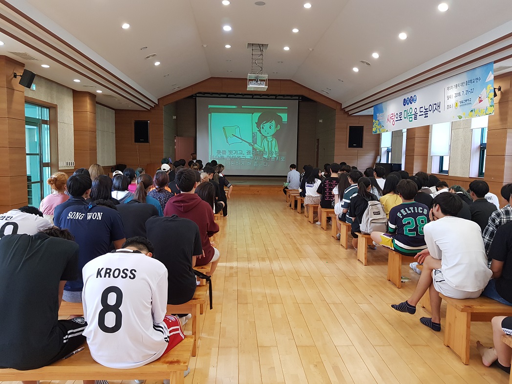 7월 18일 7교시 전교생이 토마스관에 모여 폭염에 대비하여 우리가 조심해야 할 행동과 물놀이 안전사고 예방을 위한 안전수칙에 대해서 배워보았습니다.