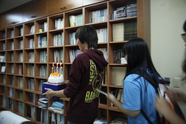아침 조회가 끝난후 잽싸게 학생회에서 축하케익을 들고 교장실로 찾아왔습니다!