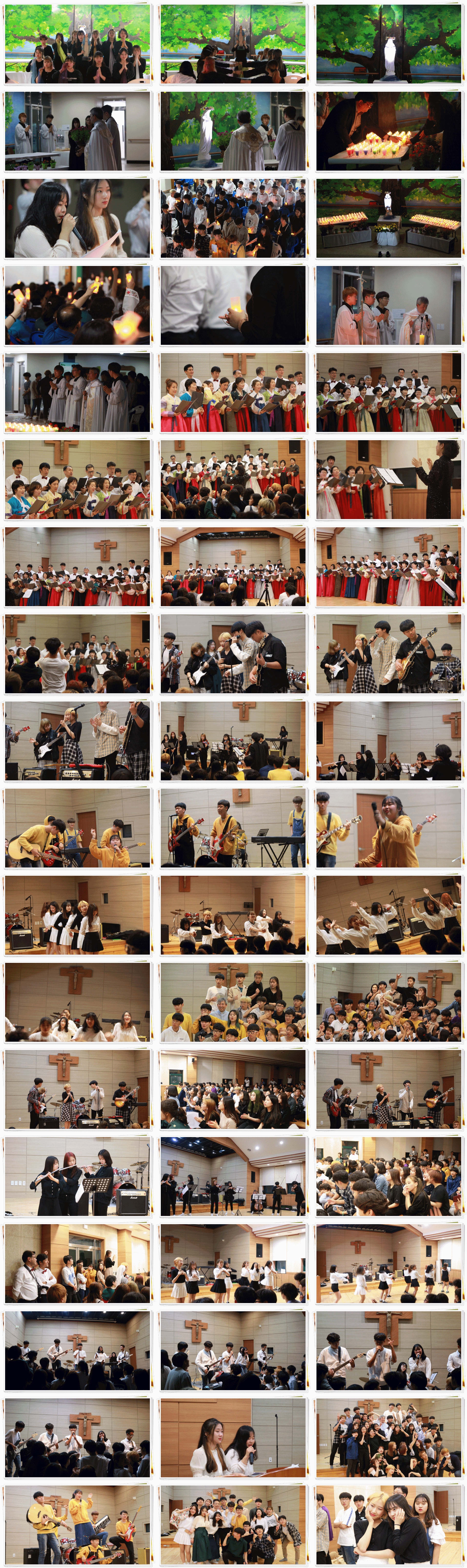 1부는 전례를 중앙홀에서 했고, 2부는 토마스 관에서 젊음의 축제공연이 있었습니다. 지금까지는 비가 오지 않아 넓은 잔디밭에서 전례와 공연이 있었지만, 올해 5월 17일에는 비가 와서 중앙홀에서 진행되었습니다.
