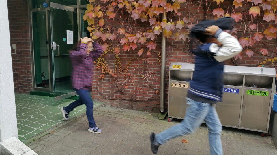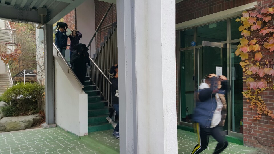 3. 떨어지는 물건에 유의하며 책가방 등으로 머리를 보호하고 최대한 건물에서 멀리 떨어진 대피장소로 피한다.