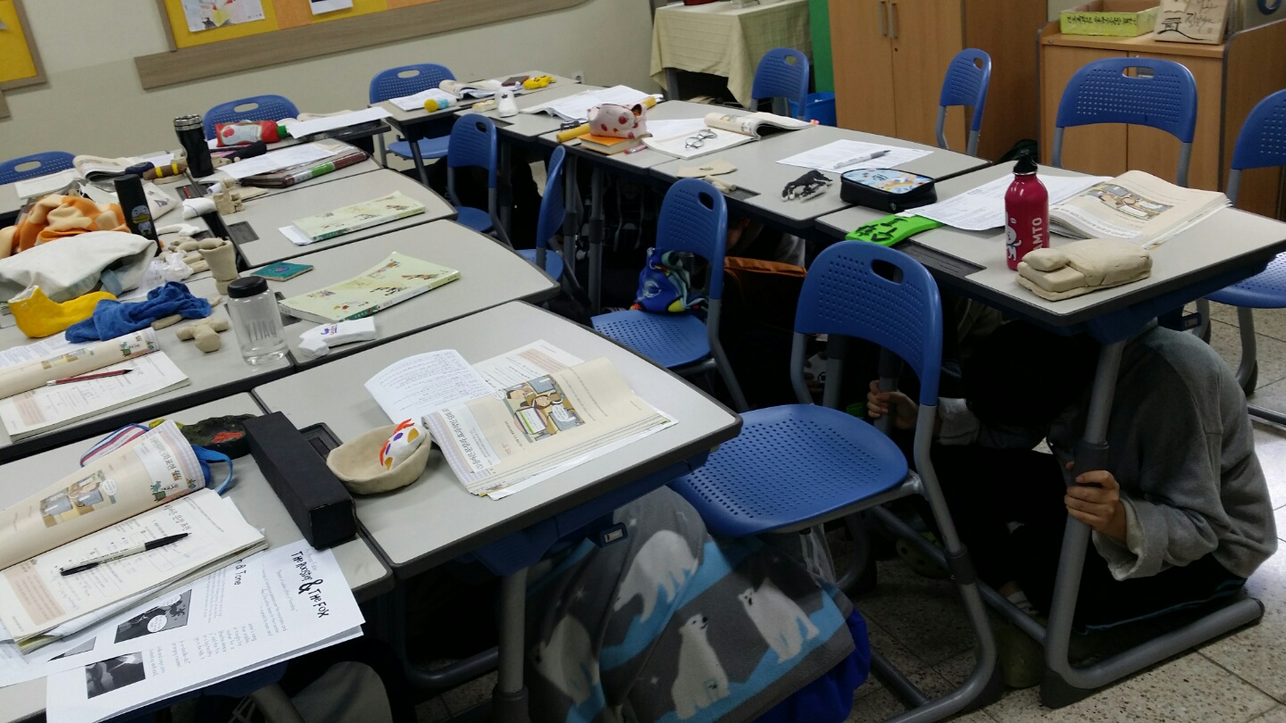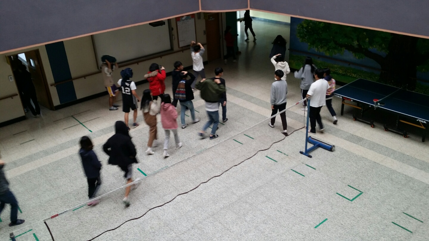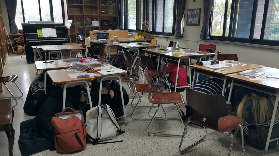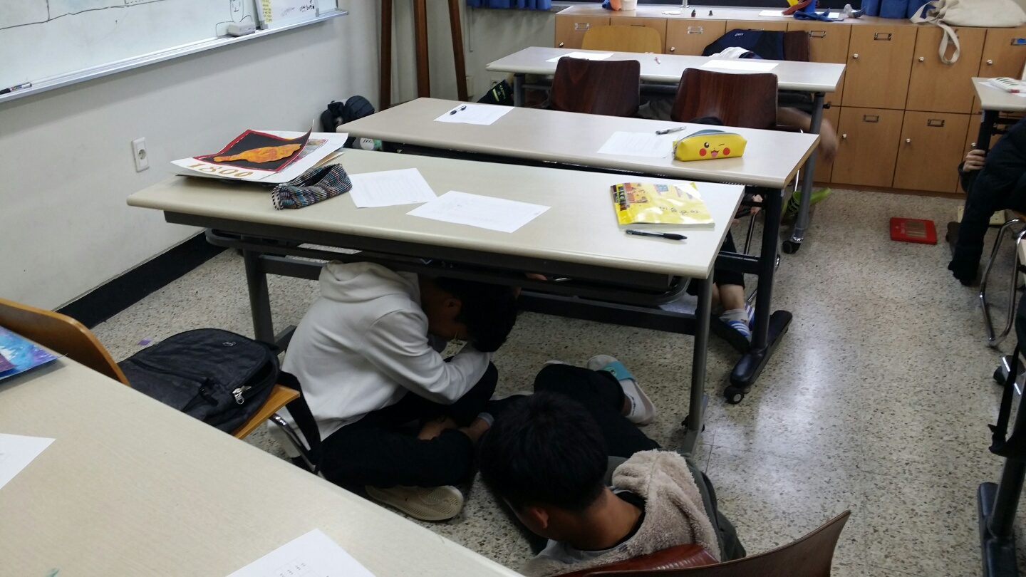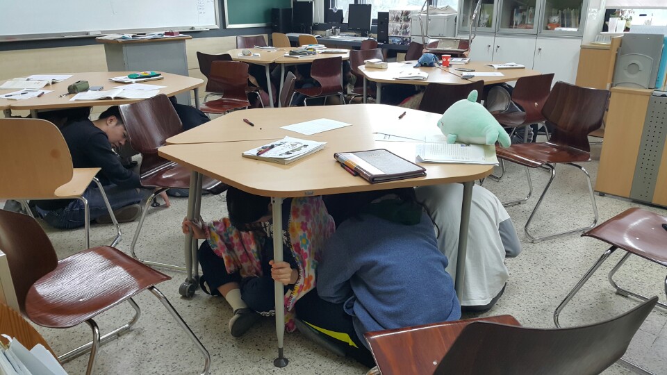 1. 책상 아래로 들어가 책상다리를 꼭 잡거나 책가방, 책, 방석, 손 등으로 보호한다.