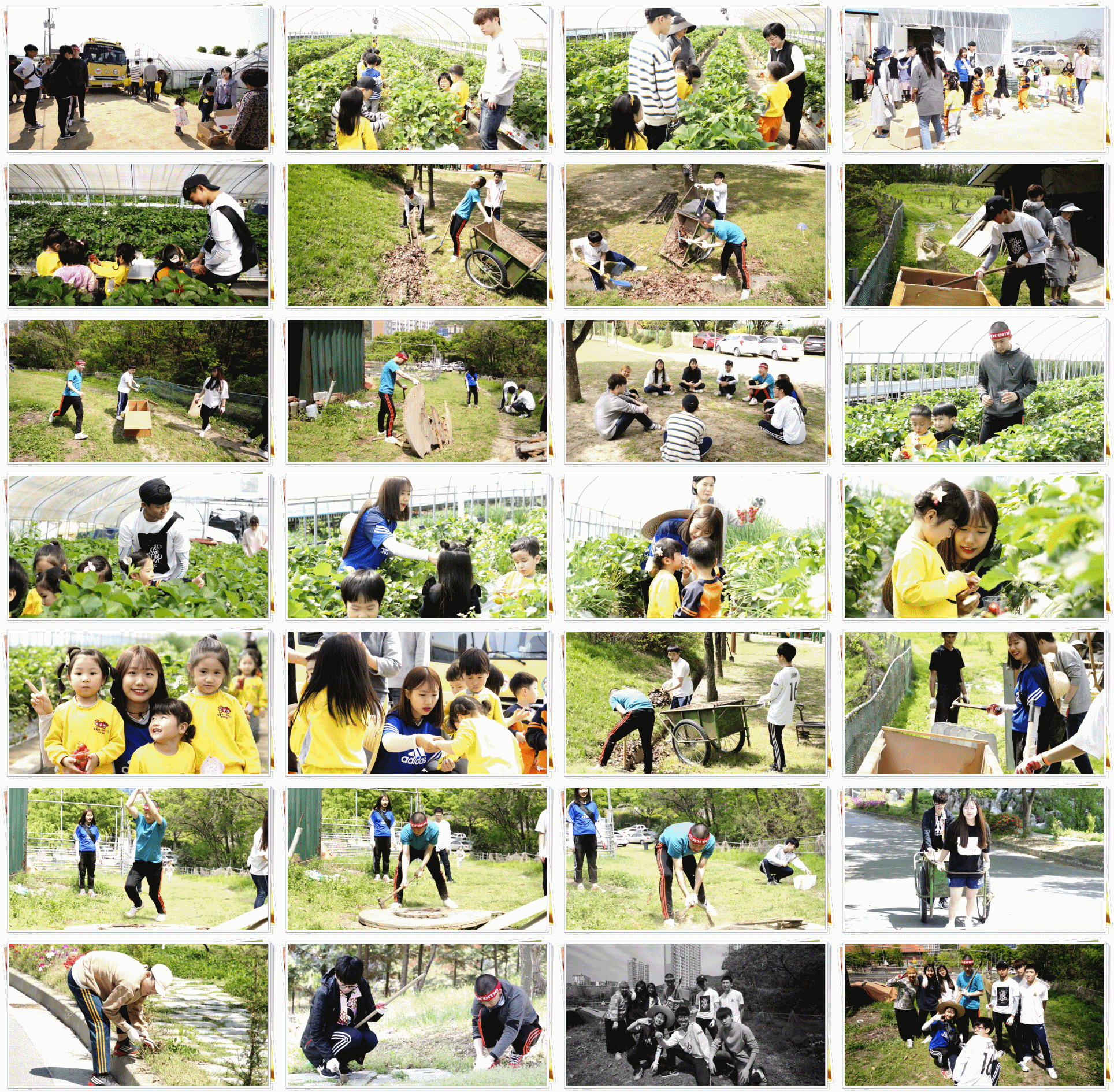 26일 딸기밭에서 체험 학습을 하는 어린이 친구들을 도와주는 것을 시작으로 오래된 창고 정리, 하수구 및 배수구 청소, 진입로 잡초 제거 및 환경정리를 이틀에 걸쳐 실시하였습니다.
